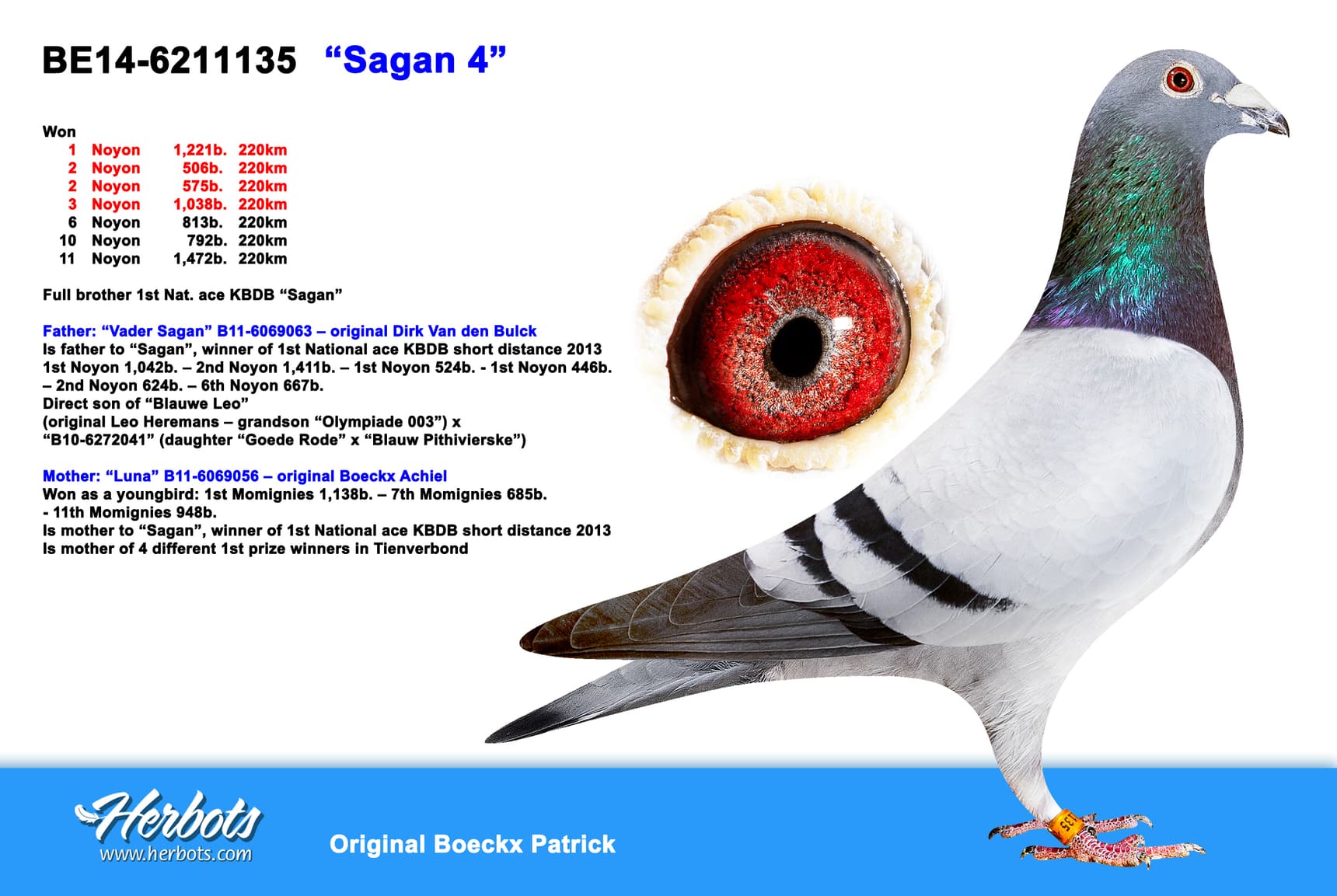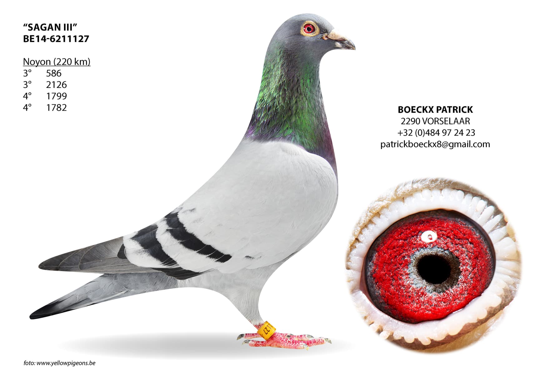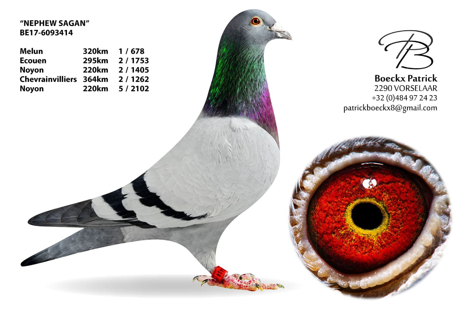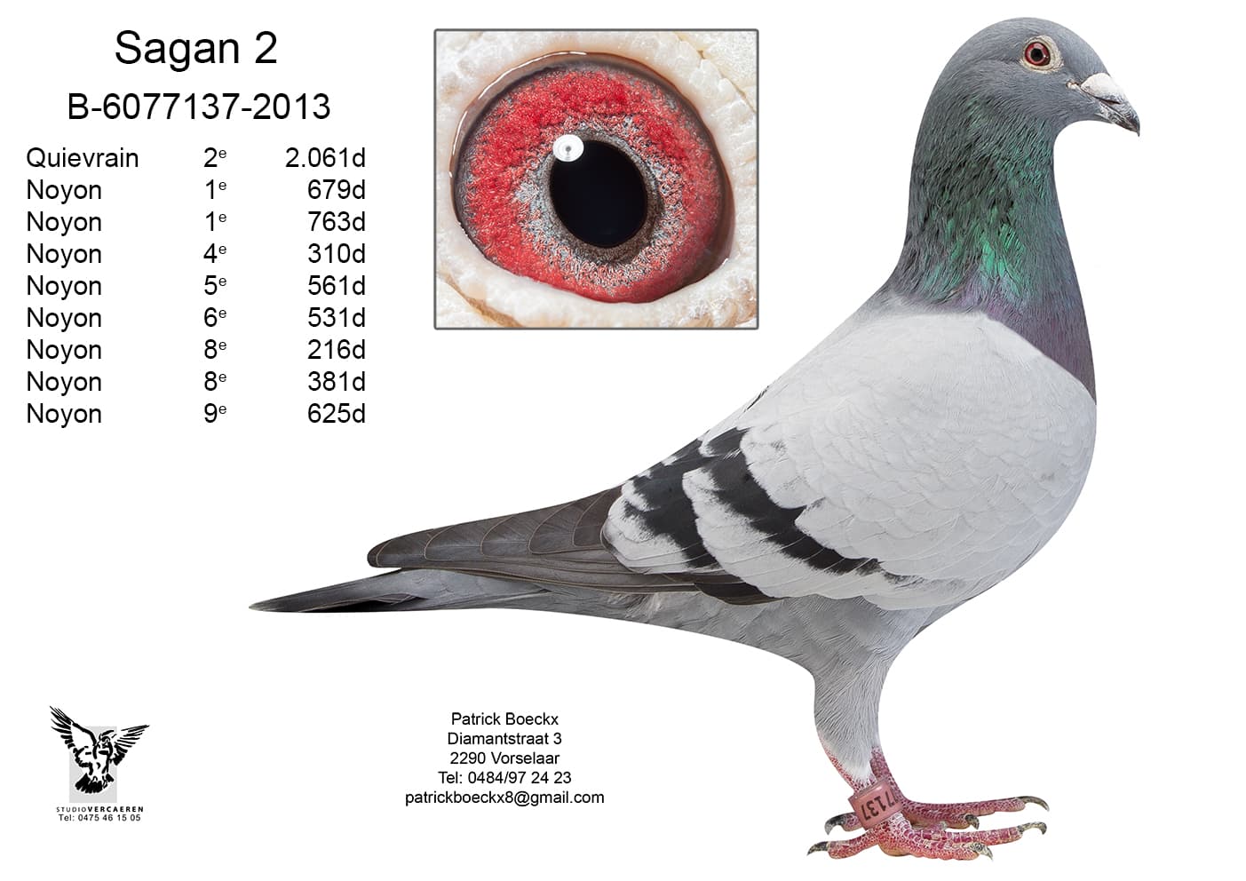 Mooie anekdote is het volgende. Nadat hij 5 top prijzen liet klokken, won hij op een Noyon vlucht net per 10-tal. Hij had een pen scheef en een kap in zijn oog, waarschijnlijk had hij serieus gevochten in de korf waardoor hij niet zo vroeg was. De week erna werd hij toch ingekorfd omdat hij nog 1 goede prijs nodig had voor het behalen van de nationale asduif titel, maar Sagan miste en dit was het teken voor Patrick om hem even rust te geven en te wachten op een signaal van de duif zelf alvorens hem terug in te korven. Patrick vertelt “Ik voederde hem 10 dagen de gekende Wal Zoontjes mengeling en hij leefde terug op, trainde terug vlotjes en kwam, zoals hij steeds deed als hij in forme was, opnieuw slecht binnen bij de dagelijkse trainingen. Dit was voor de melker het signaal om hem terug mee te geven, "Sagan" ontgoochelde niet en vloog opnieuw de 1ste vanuit Noyon en sleepte zo de titel van 1ste Nationale asduif in de wacht.