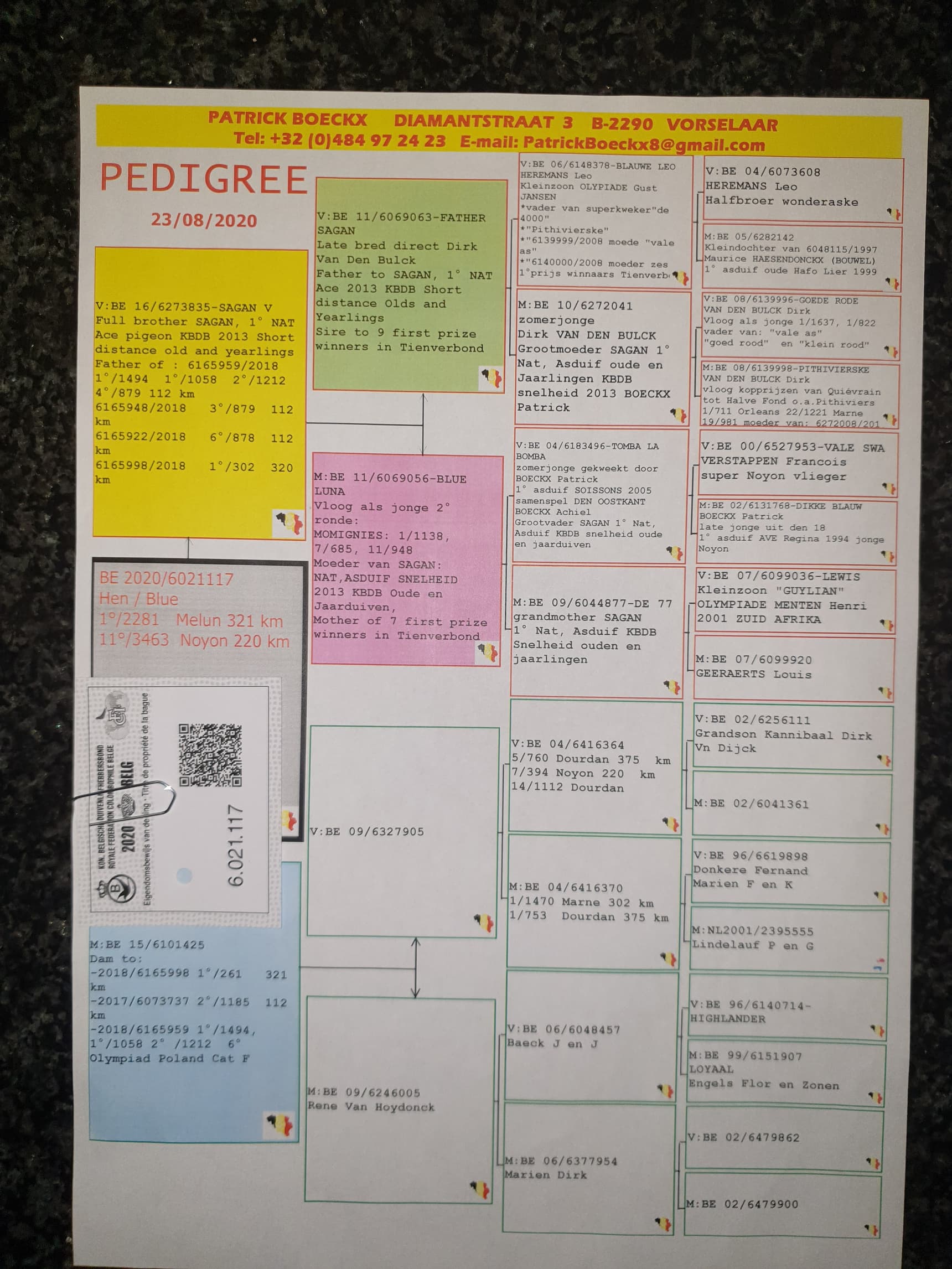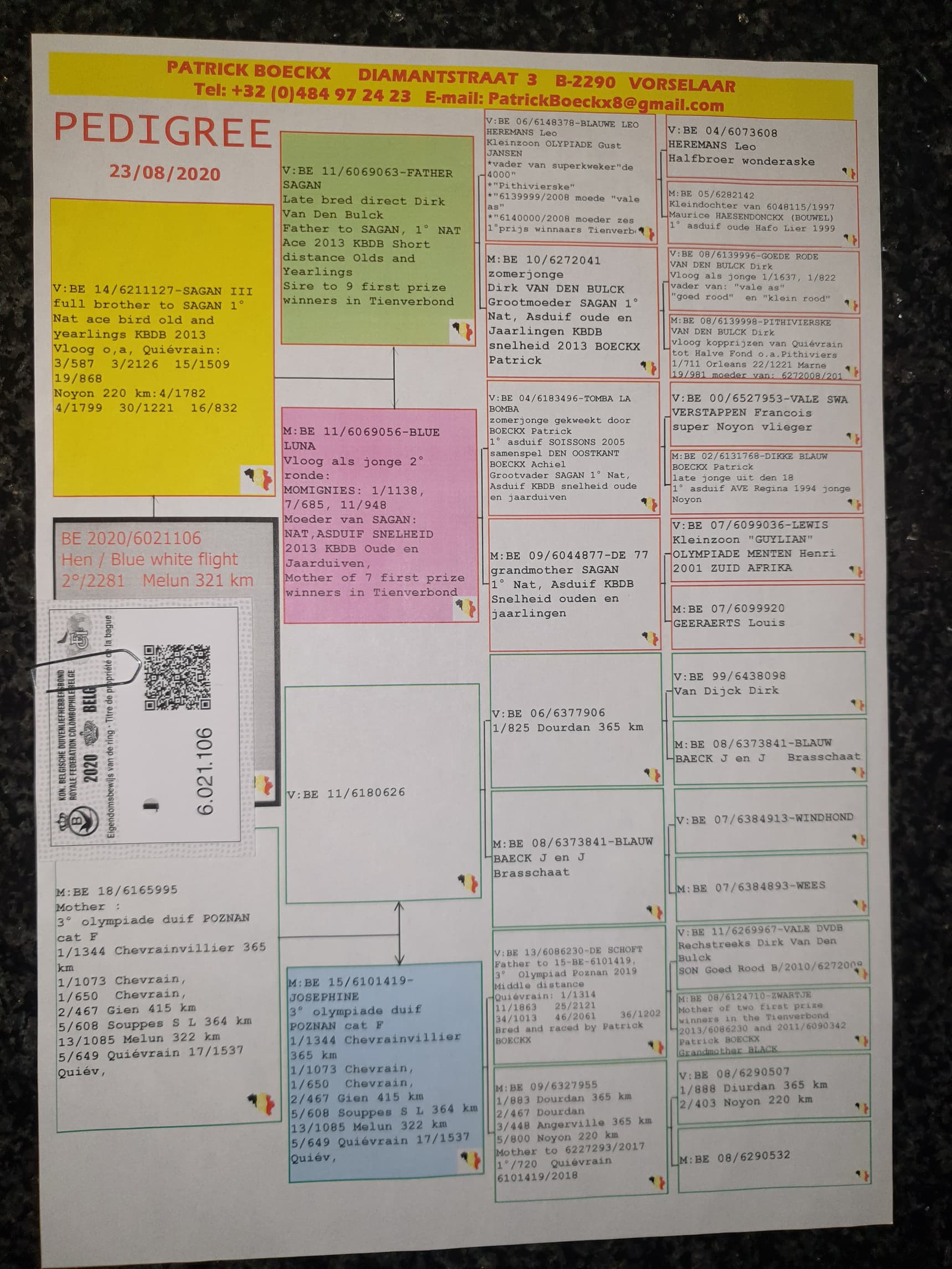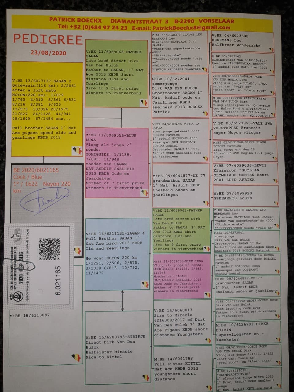 ● 6216330/2017: 1/538, 1/356, 2/402, 3/525, 4/293, 4/506, 4/839, 7/2093, 7/619, 23/2283, 20° nat asduif KBDB snelheid jaarse 2018 (bij Johny Panis).