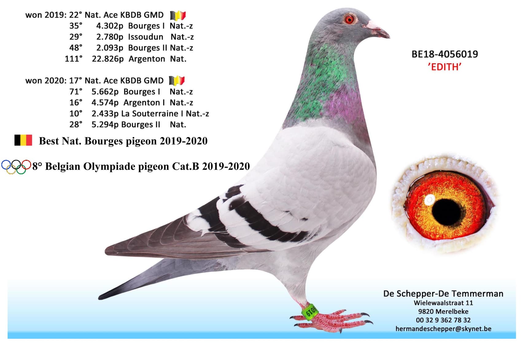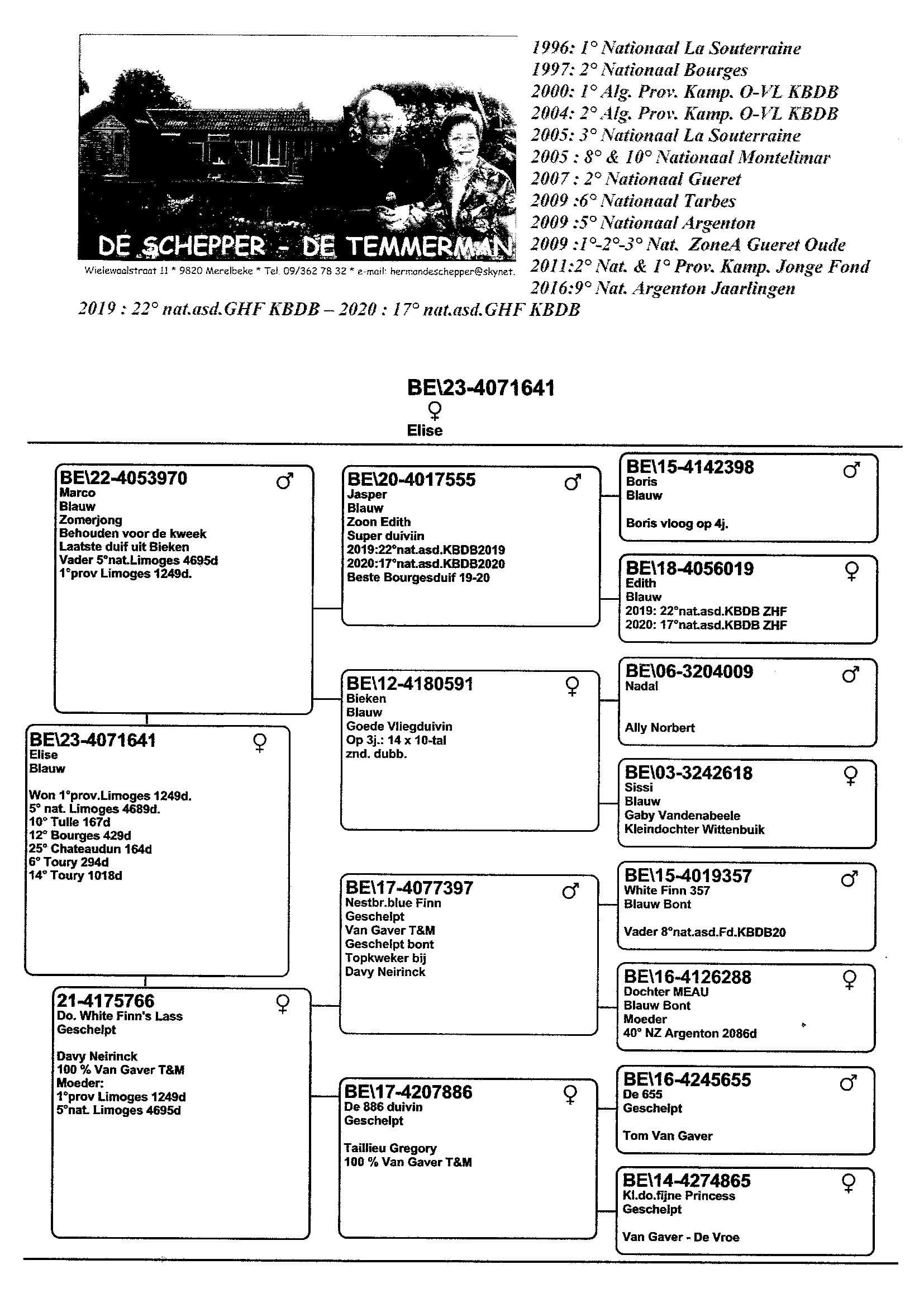 Het is een vinnig blauw duivinnetje dat de 1.248 andere Oost-Vlaamse duiven het nakijken gaf op Limoges. Met een minuutsnelheid van 1.307,77 meter per minuut plaatst ze zich ook netjes op de 5e plaats nationaal van 4.695 duiven. Ze vloog voorheen ook haar prijzen van Toury over Chateaudun, Bourges, Tulle. Ze stam van “goed bloed” binnen de kolonie. Haar vader is een kruising van de oude stam des huizes met daarin vooral de invloed van Olympiadeduivin Edith en een scheut Ally-Vandenabeele. Moeder is een duivin van Davy Neyrinck (Gavere) en is een 100 % Tom Van Gaver-duivin. Ze heeft het van geen vreemden om dergelijke zege te behalen.
