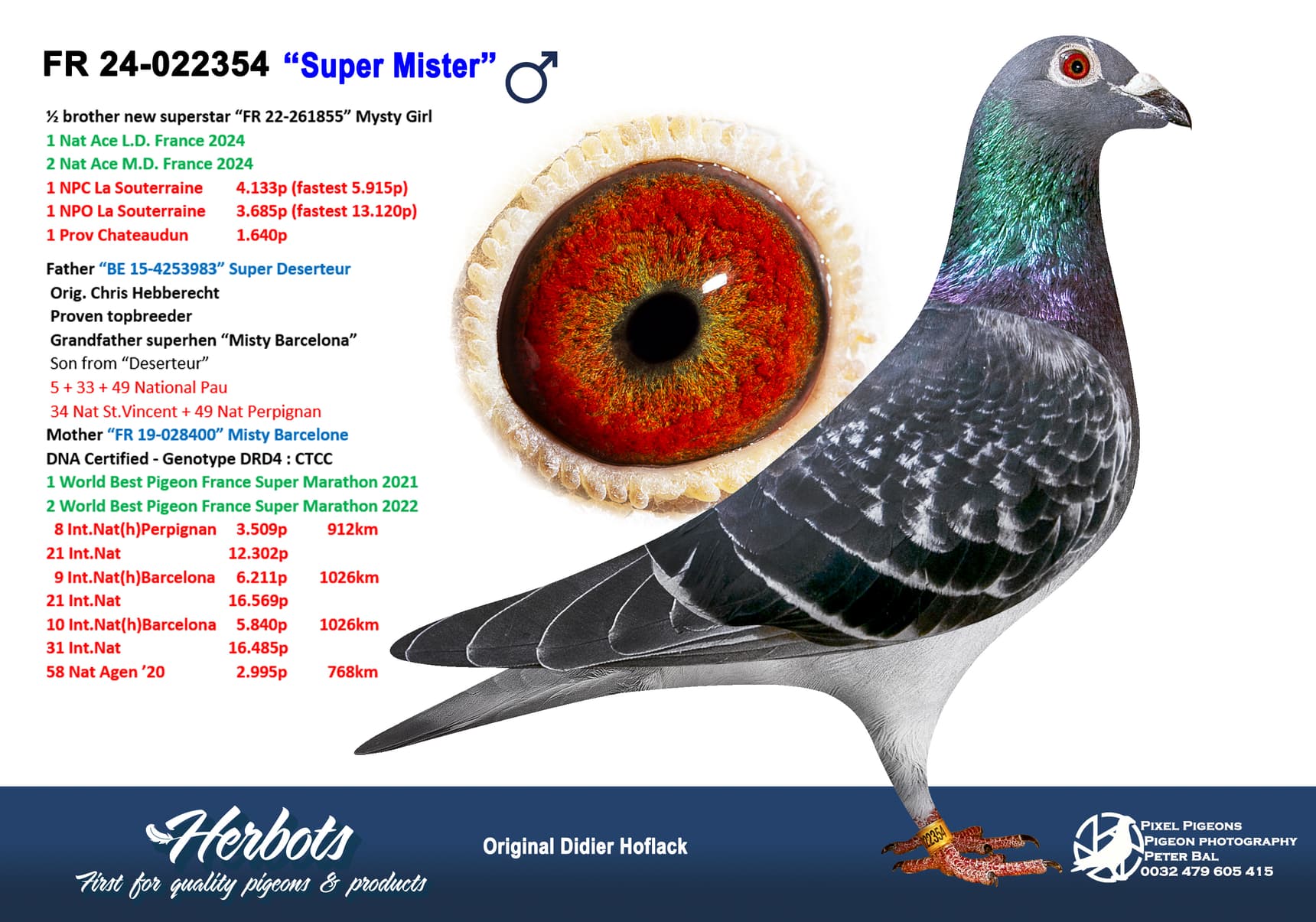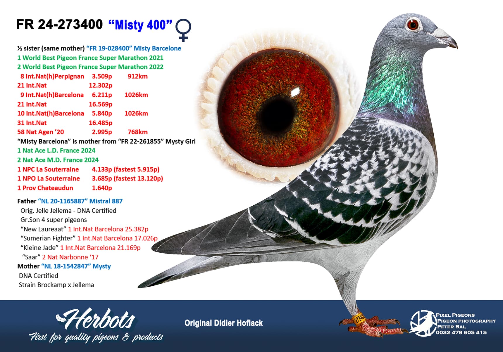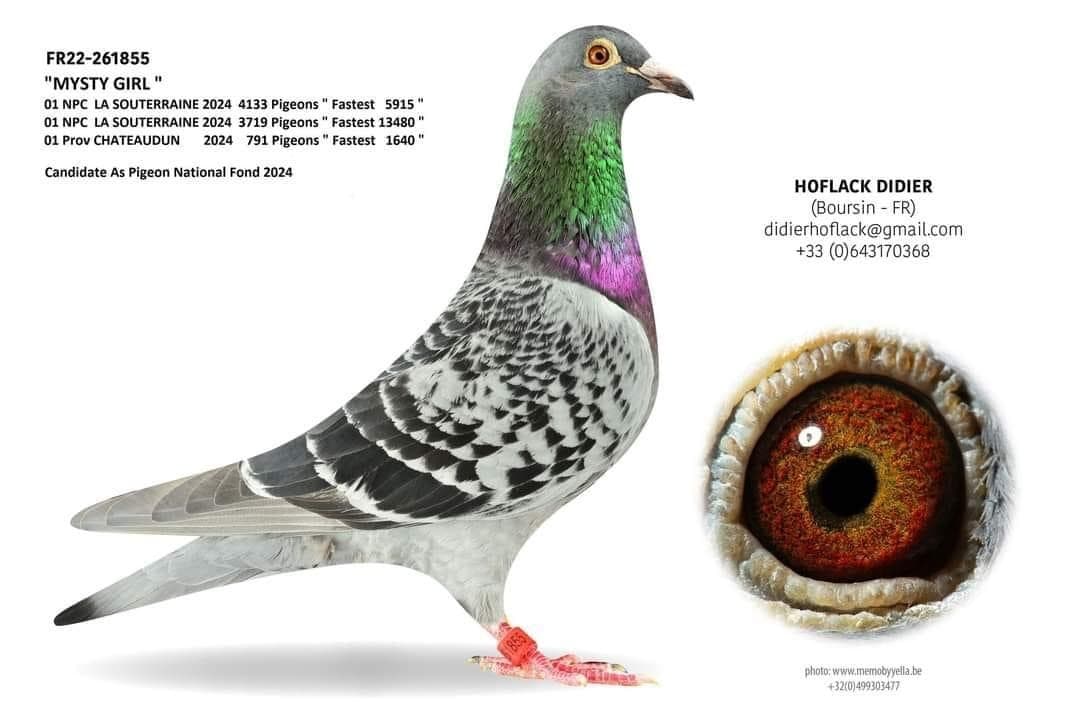 De kolonie van Didier Hoflack maakte een nieuwe start sinds 2019 met als focus de verdere vluchten vanaf de fond. Het begon met “King Jimmy” 1ste Europese Asduif zware fond, in 2020 kwam de echte start op de internationale vluchten met meerdere supersterren waaronder “Mysty Barcelona”. Deze duivin werd 2 x 1ste World Best Pigeon op de Super Marathon in 2021 en 2022. Nu in 2024 is haar dochter een nieuwe superster. “Mysty Girl” werd 1ste Nationale Asduif fond Frankrijk 2024 en 2de Nationale Asduif halve fond 2024. Ze won 3 x 1ste en was 3x de snelste van de hele lossing. Toch wel een speciale prestatie.