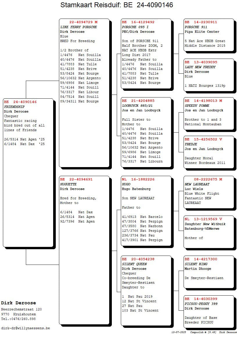 Het is de jaarling BE24-4090146, die nu met de naam Friendship door het leven gaat die de klus klaarde, de provinciale zege behaalde, nationaal een 6e plaats behaalde….en bijkomend reeds een 26e nationaal Agen op zijn conto staan heeft. Het is een duiver die hoe dan ook heel close zal eindigen in de ranking van de nationale asduiven. Hij heeft een afkomst waar heel veel goede genen zijn in opgenomen en wanneer de mix van de kweekorigine eens door de natuur goed wordt bejegend dan resulteert dit in topduiven. Zijn vader is een smeedwerk van de Porsche-New Freddy origine gekruist met een duivin van Jos & Jan Loobuyck (is een zus van de moeder van 1e nationaal Souillac). Zijn moeder is het kweekresultaat van een zoon New Laureaat (Hugo Batenburg) met een kruising van de 1e nationaal Pau van Martin Dhooge (winnaar provinciaal Dax met de oude duiven) en de Picsou-Peggy soort van Dirk.