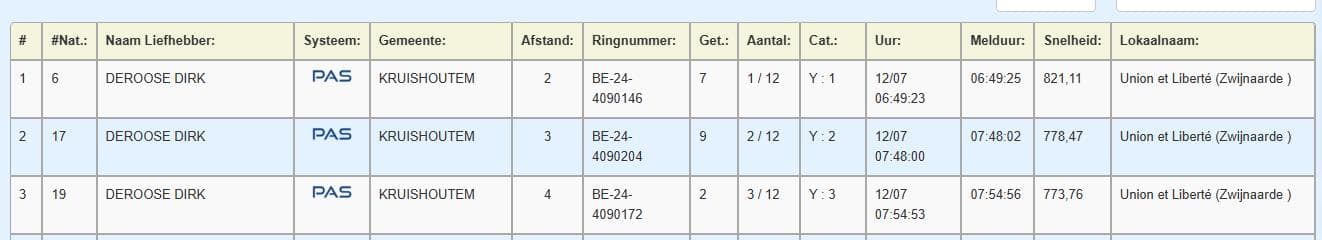 Om 7.54 u zaterdagmorgen, daags na de lossing van de internationale vlucht Dax op vrijdag, was het podium van de wedstrijd voor jaarse duiven in Oost-Vlaanderen ingepalmd door de duiven van Dirk Deroose.