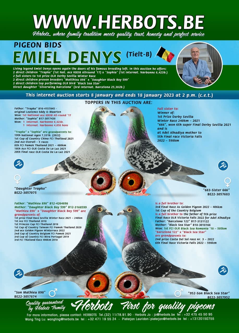 Momenteel biedt Emiel op internet verkoop Pigeon Bids een selecte groep duiven uit zijn gekende toppers en bewezen OLR duiven aan!