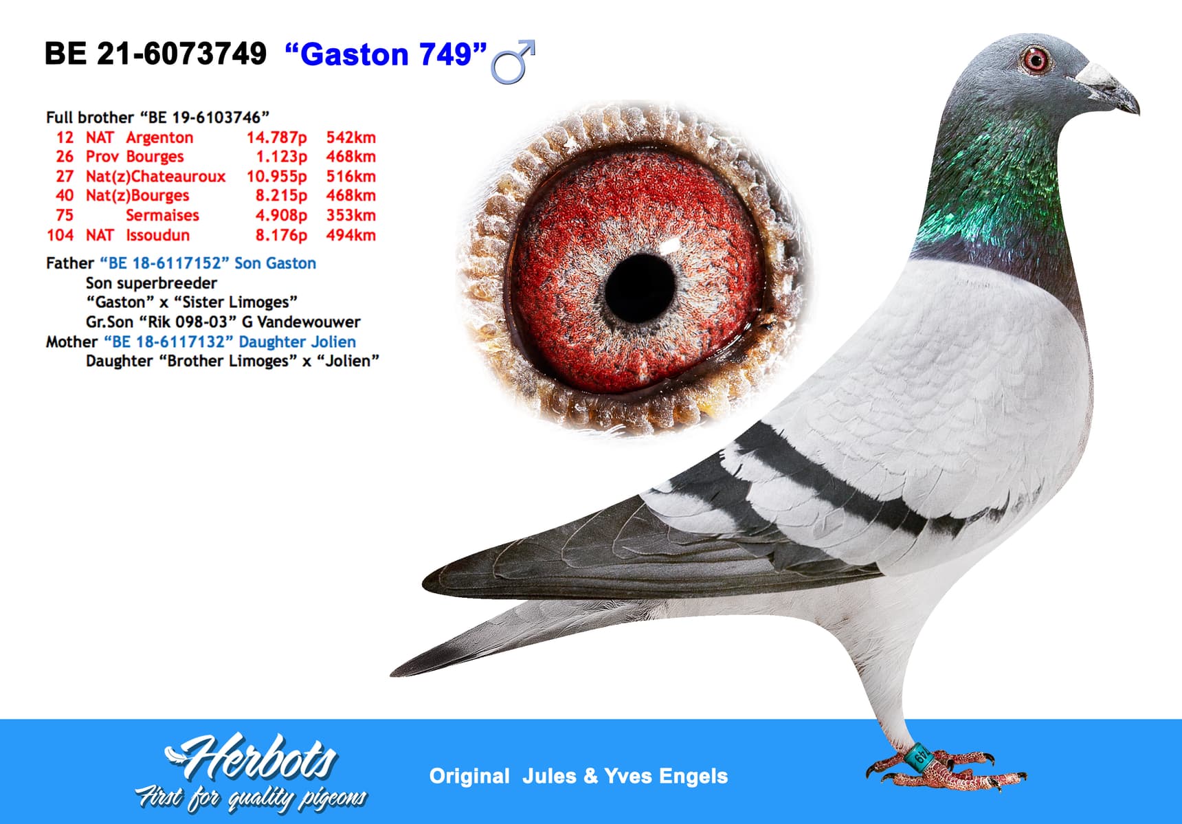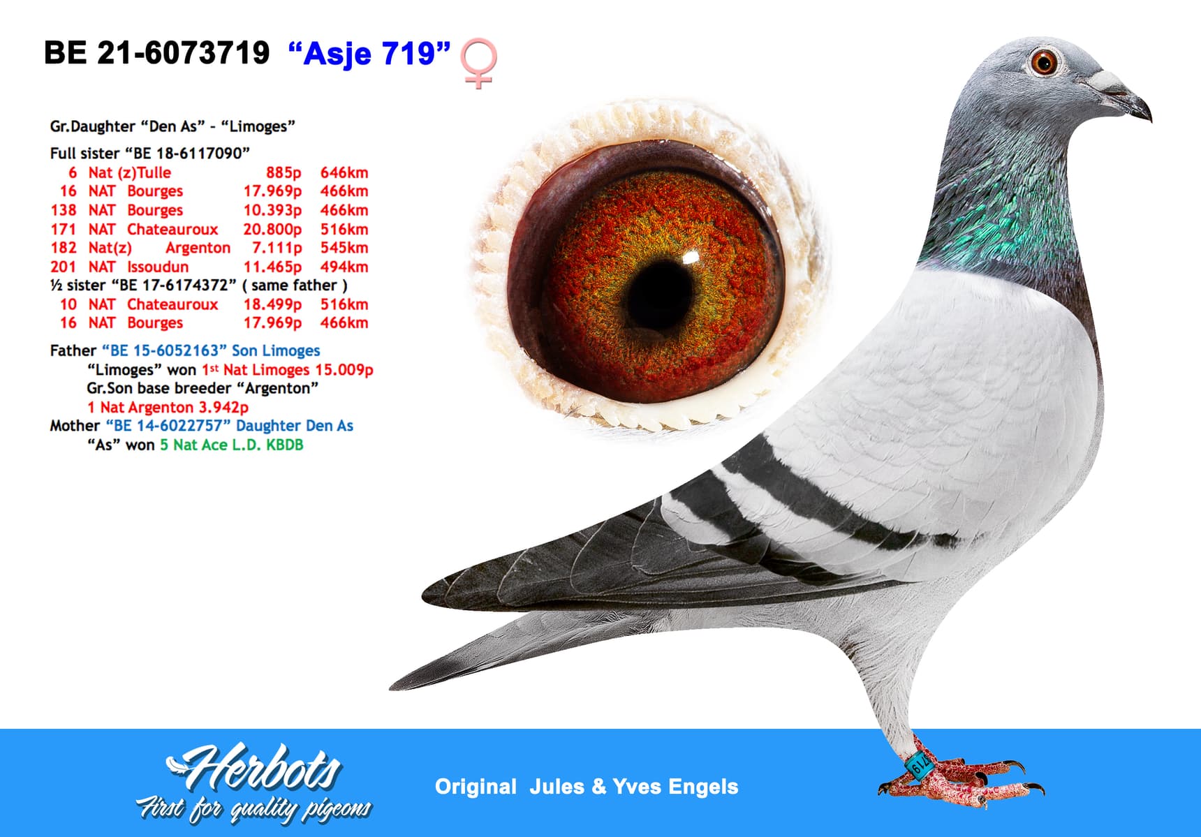 De bloedlijn waar ten huize Engels heel veel van verwacht werd en ze het ook dadelijk waar maken. “De Limoges” zelf was een superdoffer die 1ste Nationaal Limoges tegen 15.009 duiven won op de eerste fondklassieker van het seizoen.