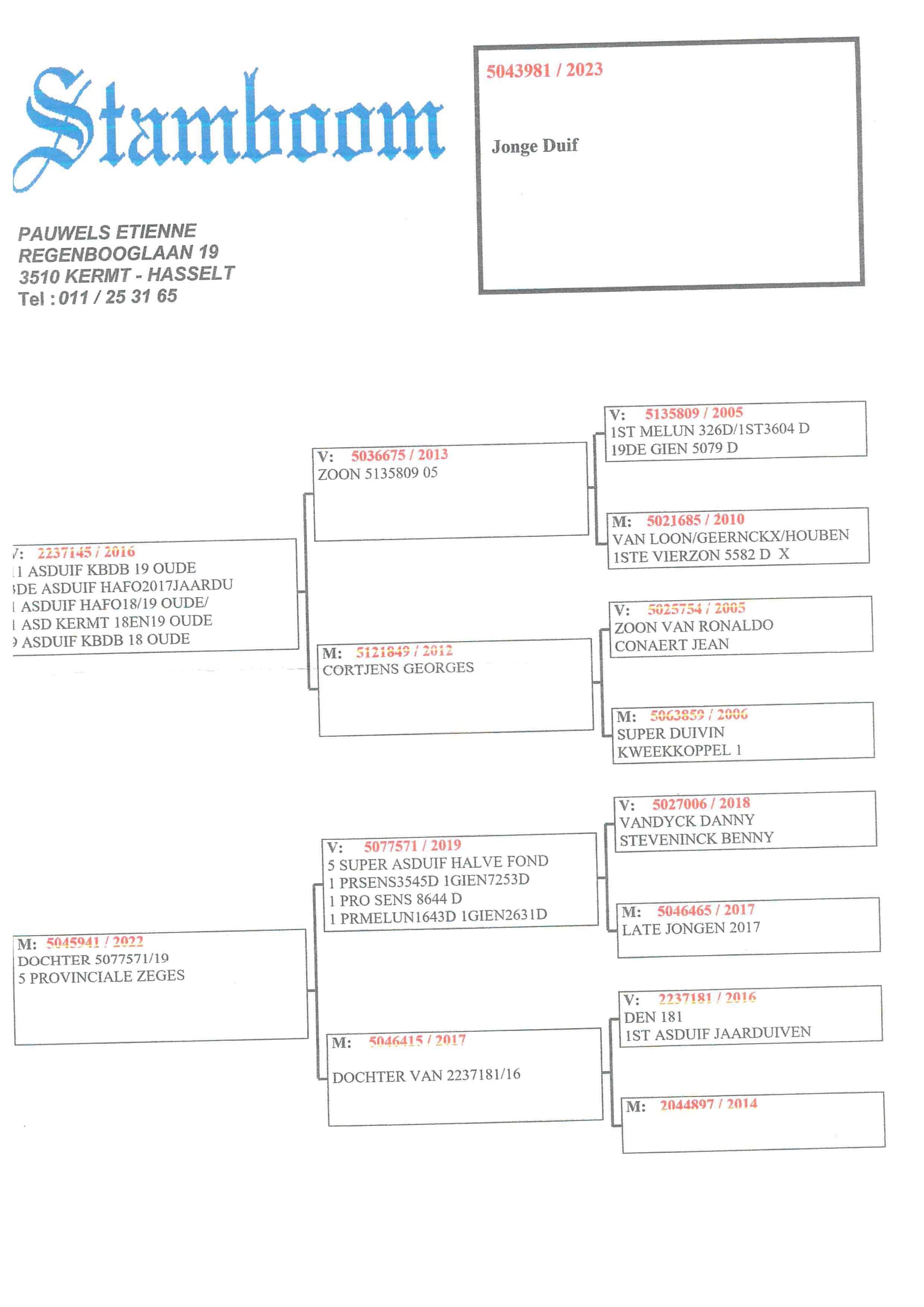 Als we in meerdere generaties de stamboom van deze topper ontleden komen we bij de duiven van Gaby Vandenabeele/Dirk Van Dyck (“Kannibaal”) en Schellens/Voets terecht.