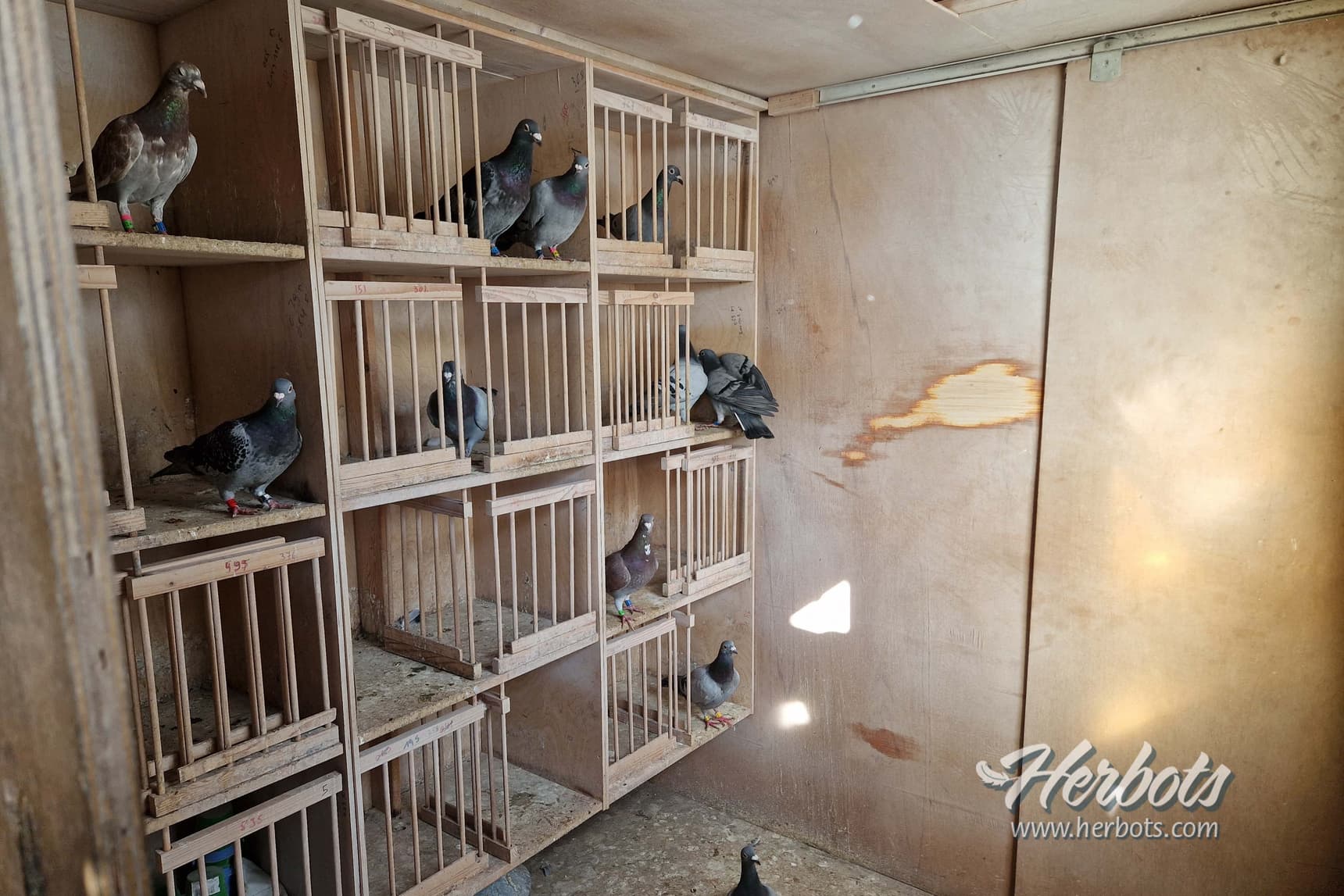 De 20 duivinnen, die in een andere afdeling zitten, worden aangezien ze opgesloten zitten, alles individueel gevoederd en hebben elk hun eigen drinkpotje ter beschikking.