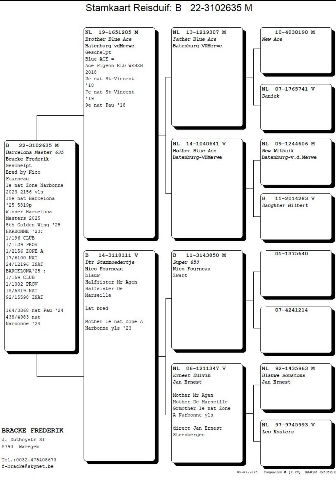 De moeder is een dochter van Nico Fourneau's basisduivin "Het Stammoedertje", uit de Super 850 x Ernest duivin koppeling.