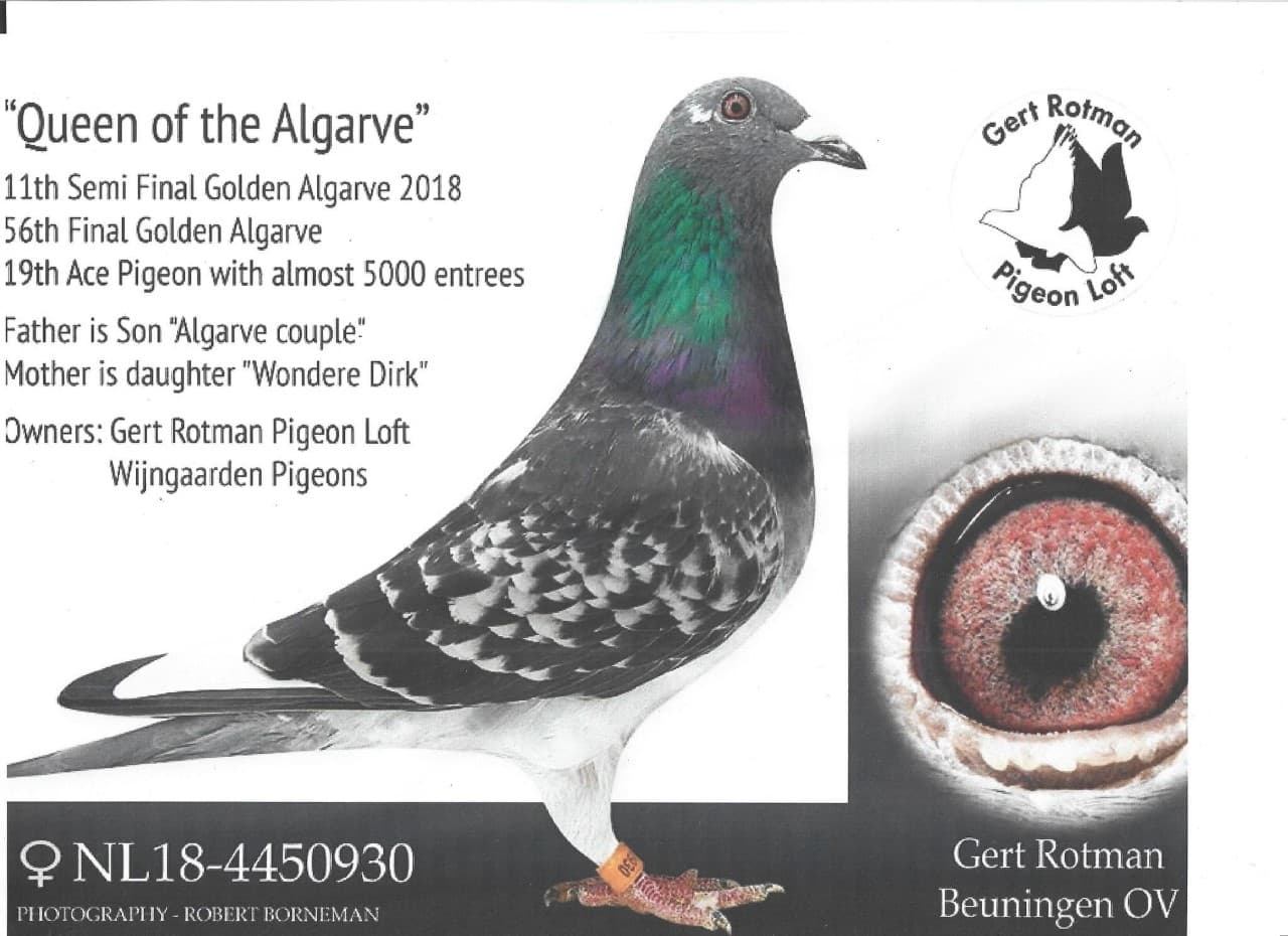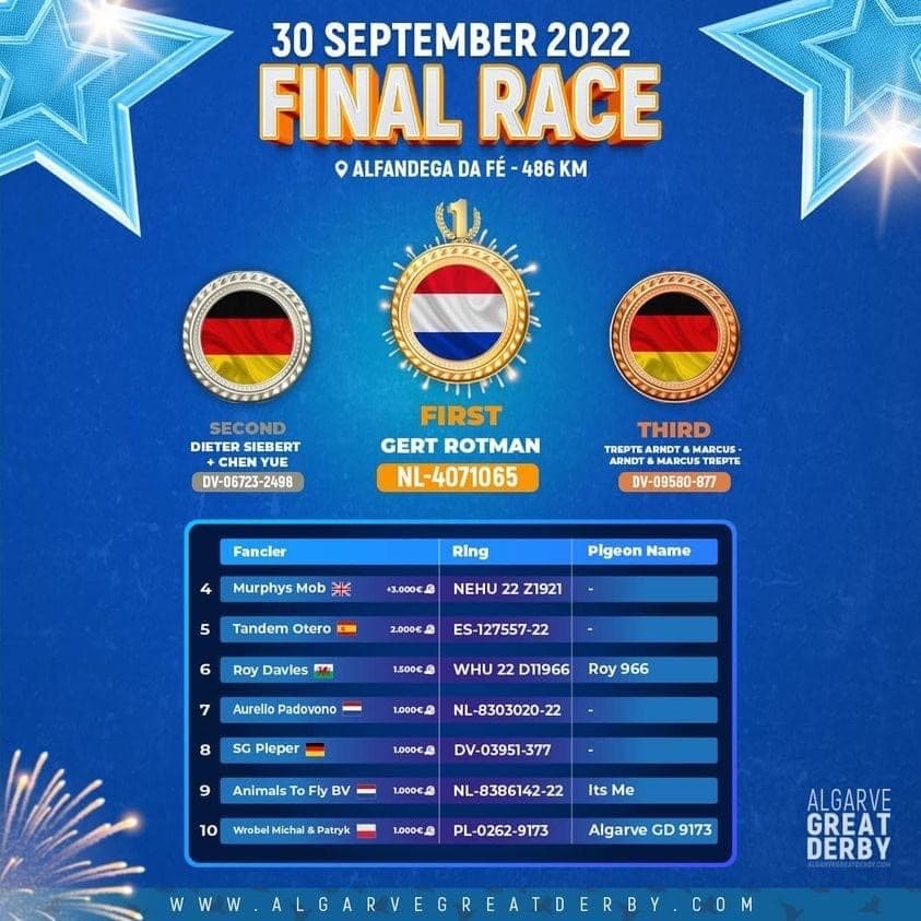 Afgelopen vrijdag stond de finalevlucht op de agenda van de one loft race in Algarve Great Derby. Er kwamen 2.063 duiven aan de start en dit voor een afstand van 486km. De halve finale vlucht was slechts 205km en nu moesten ze dus met een grote sprong richting bijna 500km. Ze kwamen met 7 duiven samen toe en de 1ste die binnenliep was “Algarve 065” van de kolonie Gert Rotman. Voor Gert de 3de overwinning op een finalevlucht in één maand tijd. Superklasse van het hoogste niveau en daarbovenop nog eens 60.000 Euro aan prijzengeld erbij.
