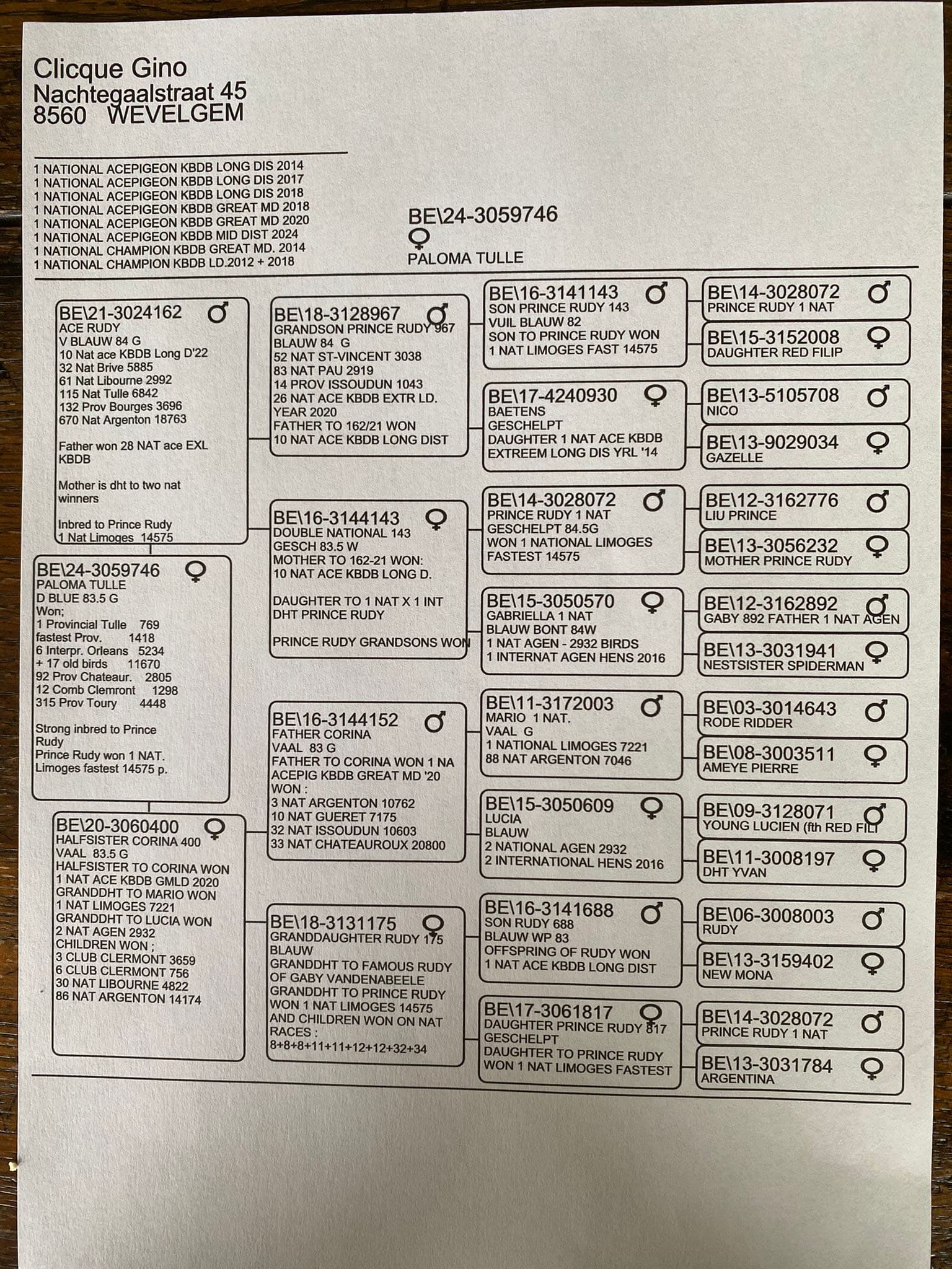 De adrenaline van de prestatie van Gaston was nog maar net aan het dalen toen er terug een opstoot was door de provinciale zege van Paloma (BE24-3059746) op de nationale race Tulle die als afsluiter van het fondseizoen werd gevlogen. Voor een afstand van 594 km was ze provinciaal de snelste van 769 duiven en ook de eerste thuis van alle duiven in de provincie West-Vlaanderen. Deze blauwe duivin stamt uit de echte basislijnen op de kweekhokken en is dochter van Asduif Rudy die 10e nationale asduif fond werd. Haar moeder is een halfzus Corina, Corina die op haar beurt 1e nationale asduif zware halve fond werd in 2020. Ze is een ingeteelde duif naar de Prince Rudy die eerste nationaal Limoges won. In haar genen zitten zowat alle succesduiven van het hok verweven en ze bewijst dit dan ook met deze mooie zege, waar ze voorheen ook reeds een 6e provinciaal Orléans vloog van 5.234 duiven. Ook zij werd op klassiek weduwschap gespeeld.