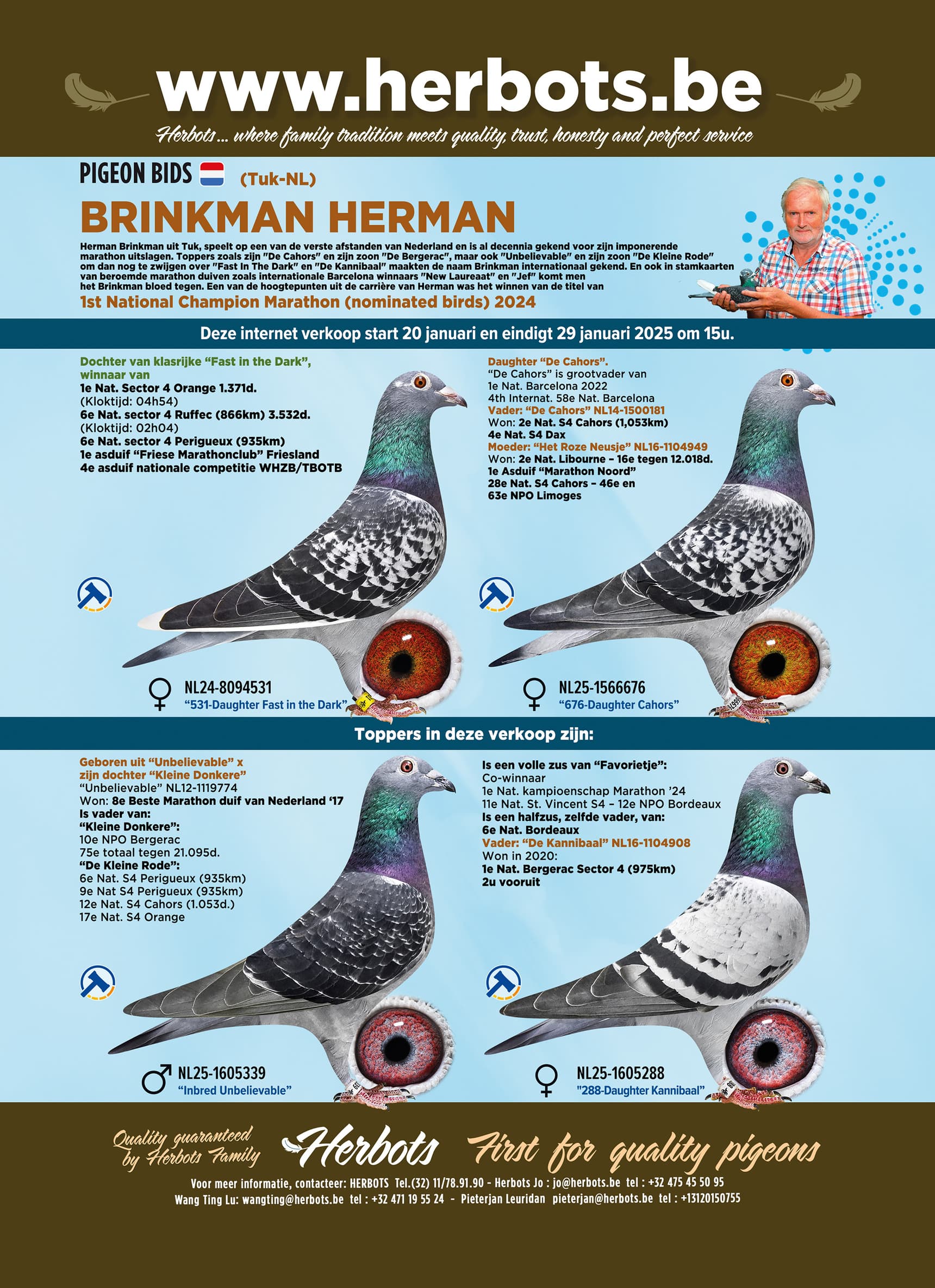 In de Nederlandse duivensport is de naam Herman Brinkman synoniem met sterk presteren op de marathonvluchten. Vanuit zijn woonplaats Tuk, gelegen in Overijssel, heeft hij zich ontwikkeld tot een van de meest gerespecteerde liefhebbers binnen de zware fond. De immense afstanden van vluchten zoals Barcelona (1.308 km), St. Vincent (1.153 km), Cahors (1.053 km), Agen (1.053 km) en Perigueux (935 km) vereisen duiven met een ijzeren doorzettingsvermogen. De Brinkman-duiven bewijzen keer op keer dat ze deze vluchten aankunnen.
