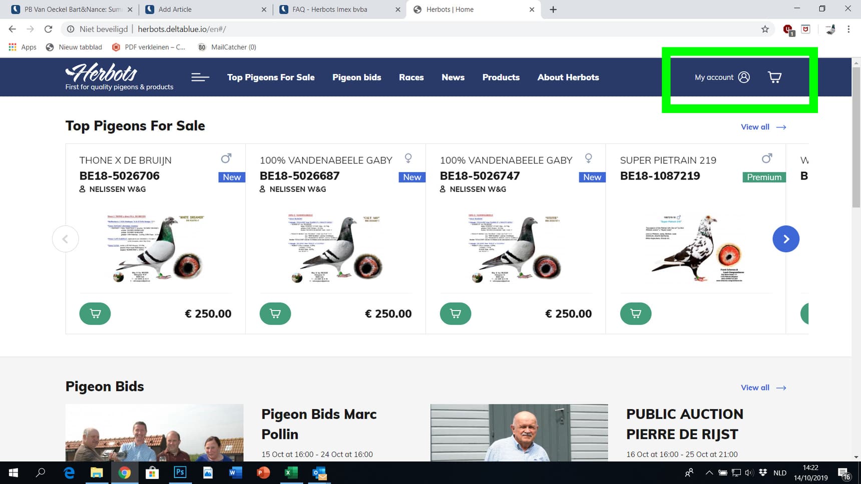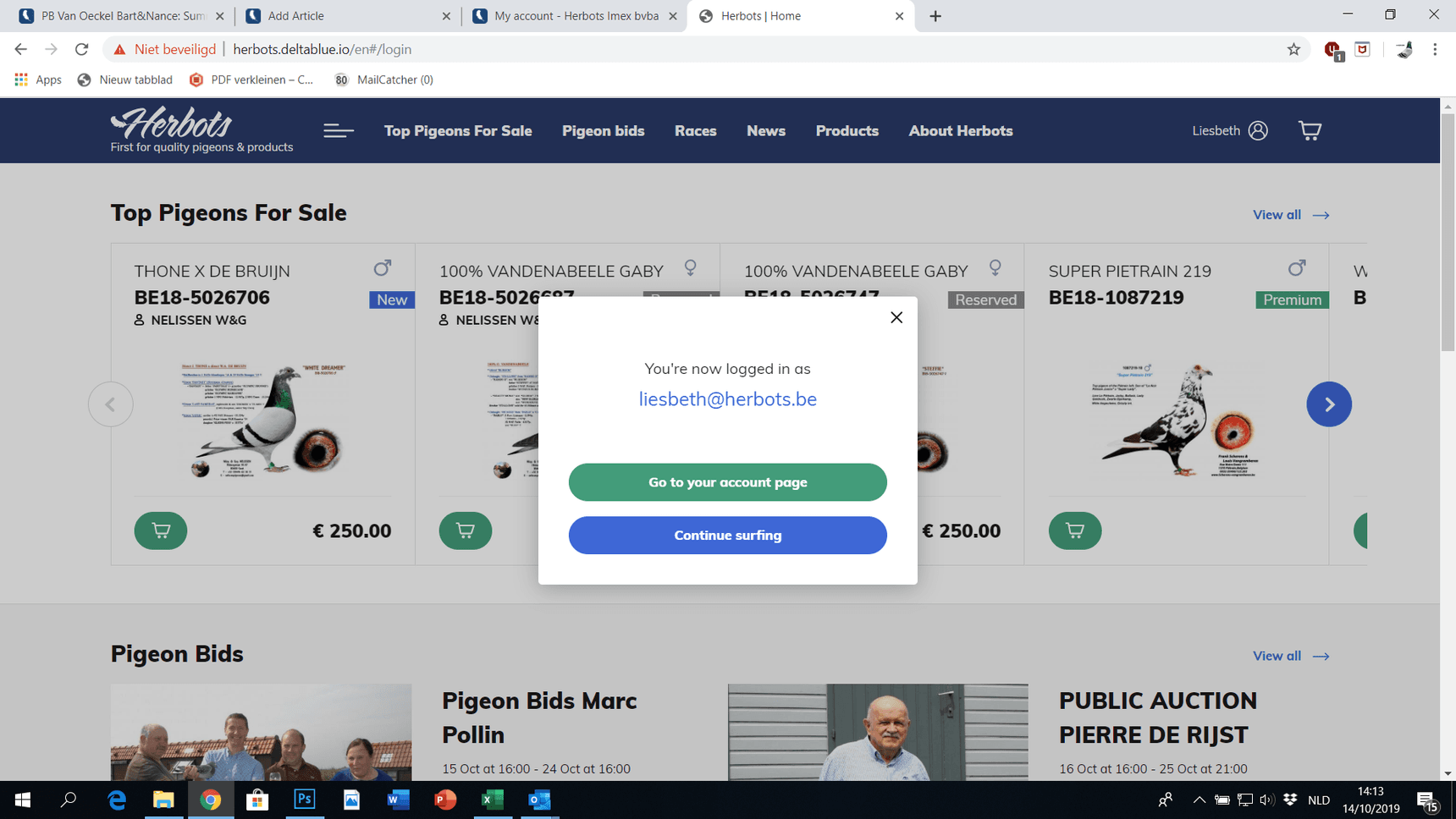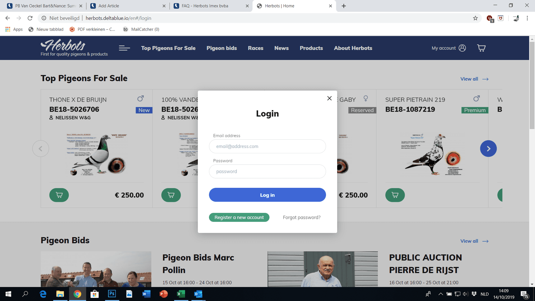U heeft zich voordien reeds geregistreerd ('Hoe registeren?') en kan nu dus onmiddellijk inloggen op onze website, waarna u makkelijk duiven of producten kan aankopen.