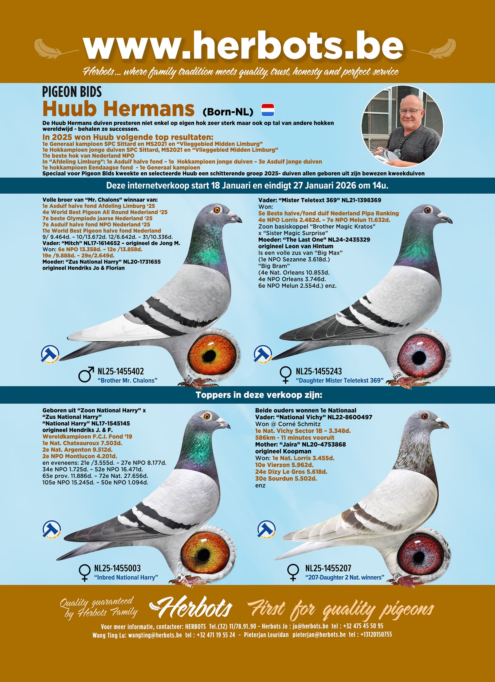 Huub kweekte en selecteerde enkele topduiven geboren uit zijn allerbeste kwekers en biedt deze momenteel op internetverkoop Pigeon Bids aan. Deze verkoop eindigt dinsdag 27 januari om 14u.