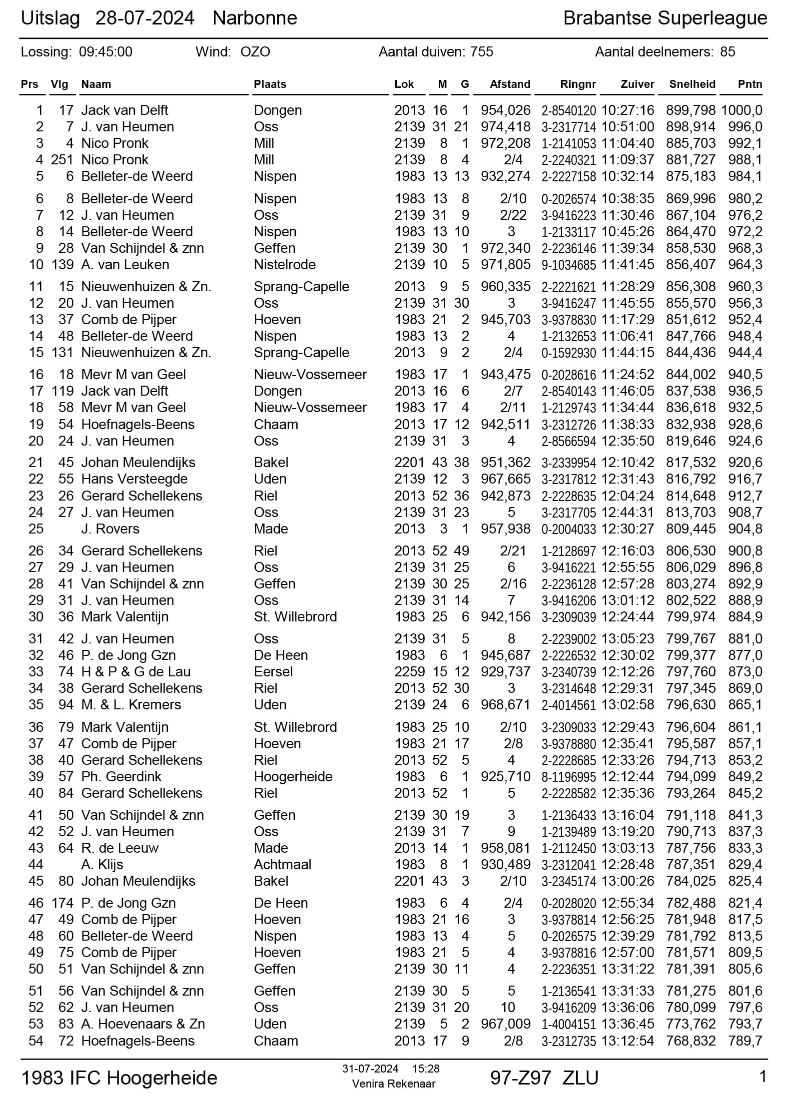De Brabantse Superleague bracht 755 duiven aan de start, bijeen gebracht door 85 liefhebbers. Het percentage jaarlingen was dit jaar aanzienlijk minder dan voorgaande edities. De verliezen op Agen ZLU en Bordeaux zullen hier absoluut debet aan zijn. De snelste duif in tijd en meters moeten we zoeken in Dongen en wel bij sportvriend Jack van Delft, hij klokte zijn bovenste van de poulebrief om 10.27.16 uur op een afstand van 954 km, goed voor 899 mpm, oftewel 54 km per uur. Da’s geen kattenpis om met een dergelijke snelheid een concours te winnen in de Brabantse Superleague. En als ik u dan vertel dat de heer Van Delft maar 0,8 mpm overhoudt t.o.v. nummer 2, het kampioenenhok van Jeroen van Heumen uit Oss, ziet u dat elke seconde telt. Onze felicitaties gaan uit naar de triomfator van BSL Narbonne 2024, de heer Jack van Delft uit Dongen en voorts een dikke proficiat aan alle prijswinnaars in deze uitslag.