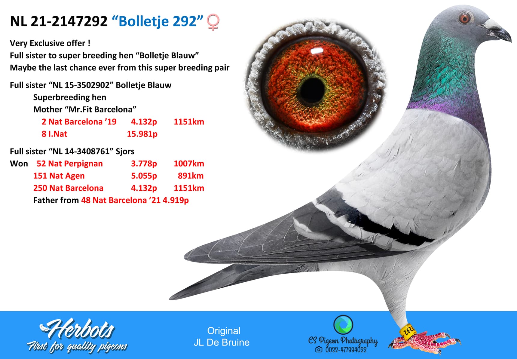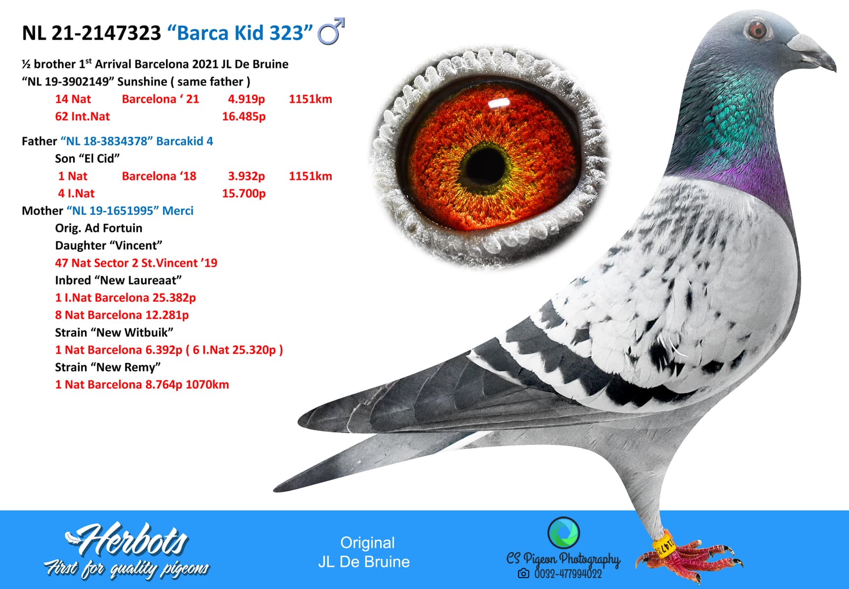 De 1ste duif is een dochter van “Barcakid 4”. Hij is op zijn beurt dan weer een zoon van “El Cid” 1ste Nationaal Barcelona ’18 3.912 duiven. De Moeder van is “Super 836”, een rechtstreekse PWA Van der Meulen en dochter van “Stamvader 823/05”. Uit deze klasbak komen meerdere superduiven de voorbije jaren.