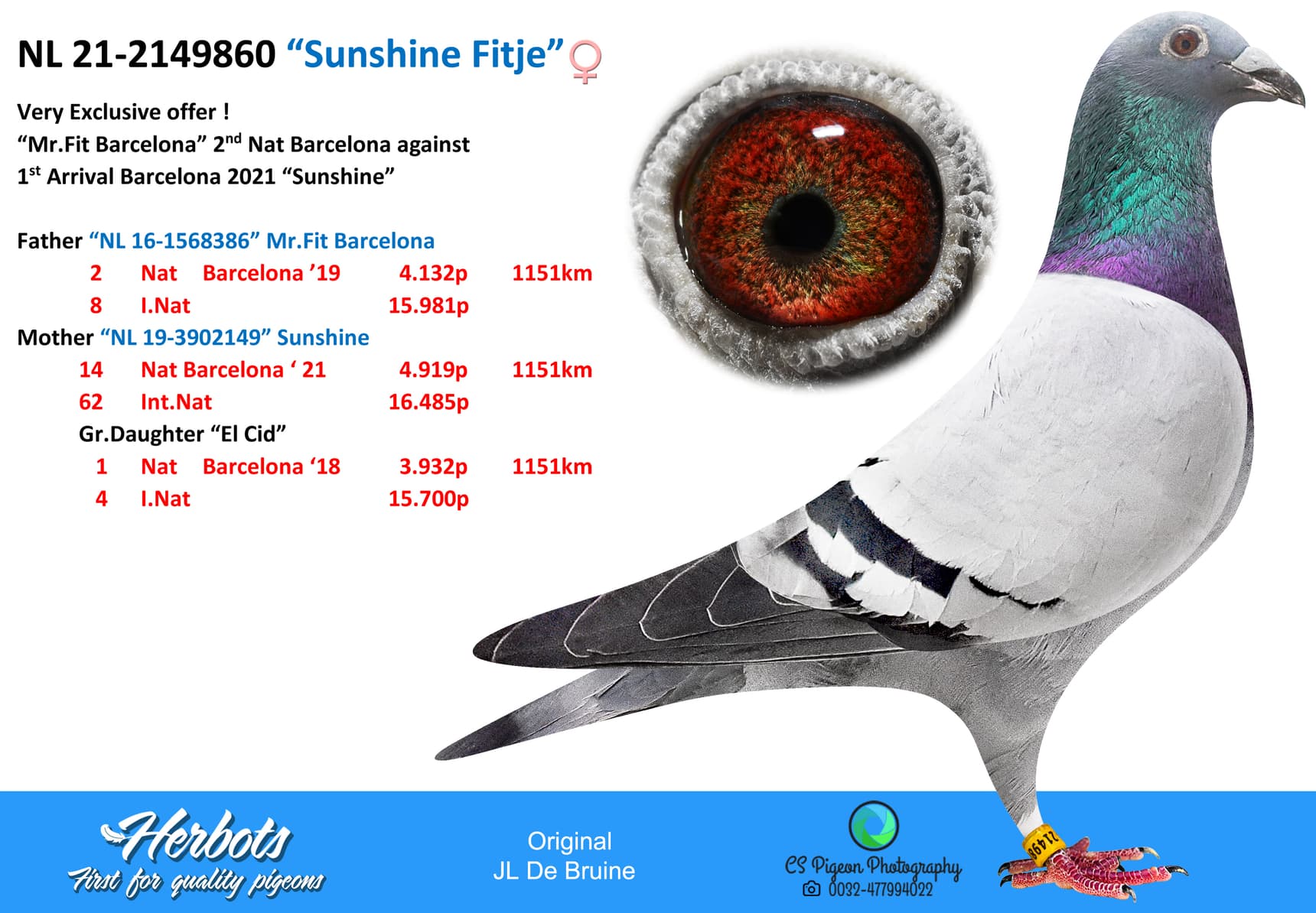 Een dochter van nieuwe topkweker “Barca Kid 4” ( Zoon El Cid 1ste Nationaal Barcelona ’18 3.932d ) en vader van topduivin “Sunshine” 14de Nationaal Barcelona 2021 tegen 4.919 duiven.