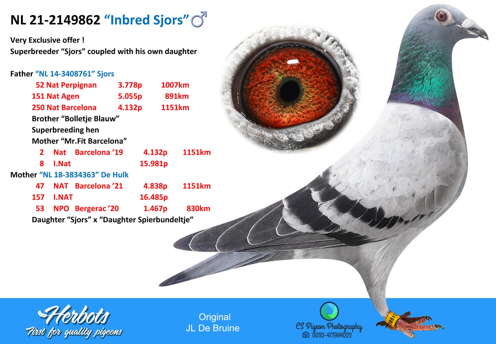 Een zoon van topvlieger “Sjors” die zelf 52ste Nationaal Perpignan 3.778 duiven won en nu gekoppeld werd aan zijn eigen dochter “De Hulk” 47ste Nationaal Barcelona 2021 tegen 4.838 duiven.