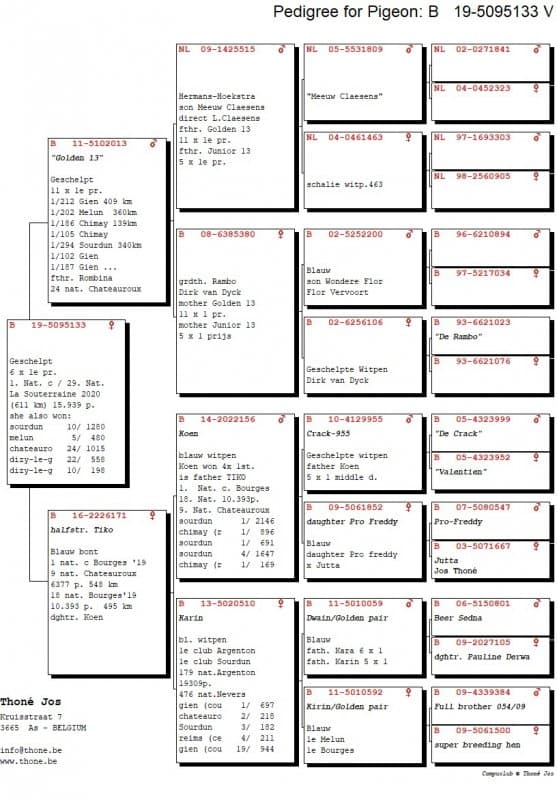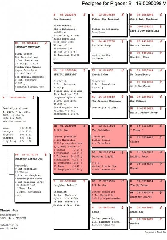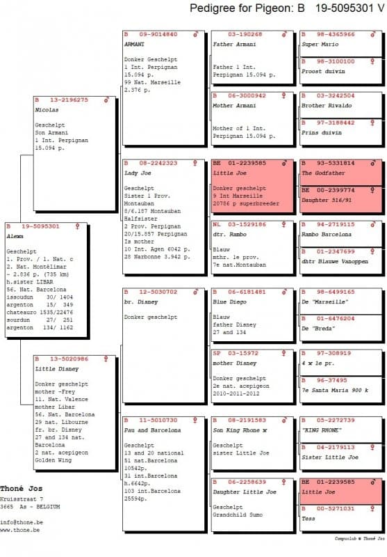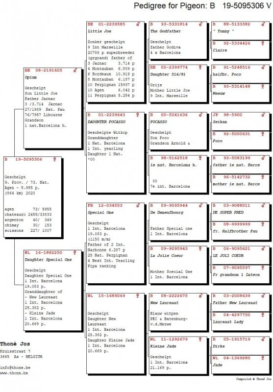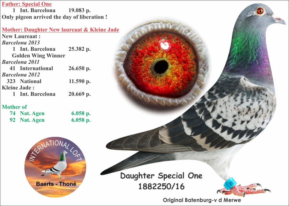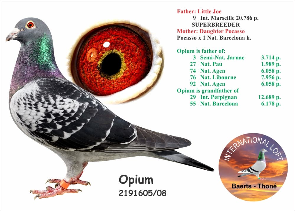 Vader is Opium een bewezen topdoffer uit Little Joe gekoppeld aan de 1 Nat. Barcelona duivinnen van A. Steegmans. Verder vinden we in de pedigree Arnold (1 Int. Barcelona), Gerda (1 Int. Barcelona) en Poco 1 Nat. Barcelona ‘95 duivinnen en snelste jaarling Barcelona ’93. Opium zat gekoppeld aan ‘Dochter Special One’ een dochter Special One (1 Int. Barcelona) toen die gekoppeld zat aan een dochter New Laureaat (1 Int. Barcelona )x Kleine Jade (1 Int. Barcelona). De zusjes hebben dus 5 Internationale en 2 Nationale Barcelona winnaars in hun afstamming. Goed bloed liegt niet. Er werden 9 prijzen behaald van de 11 ingekorfde jaarlingen.