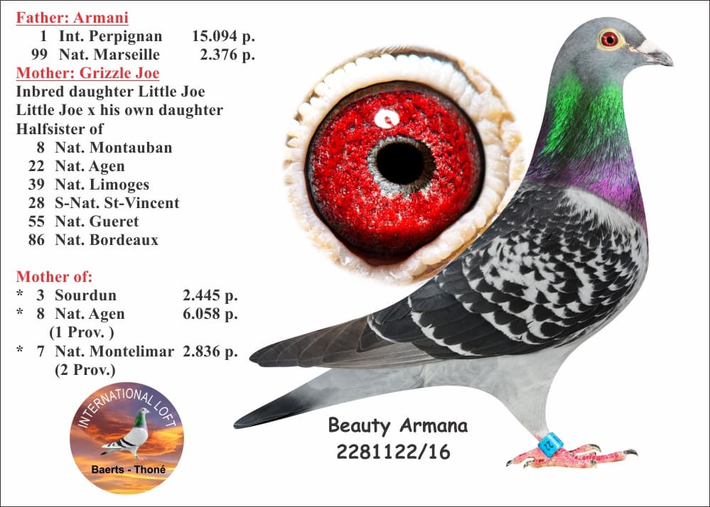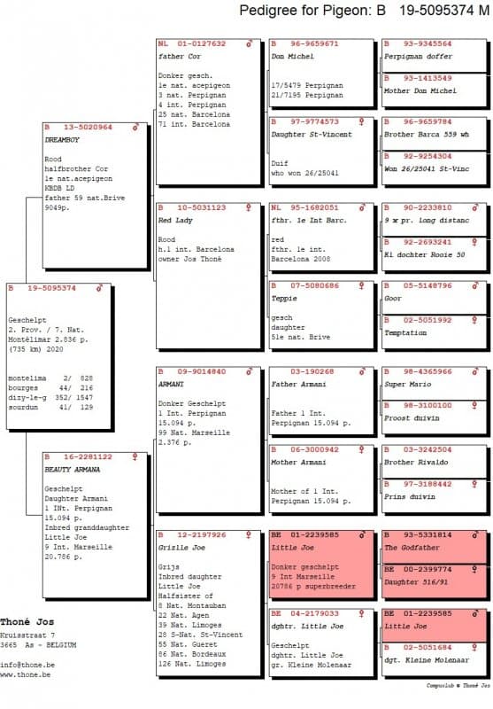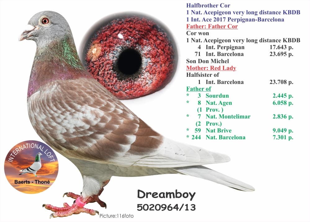 2e Prov. en 7e Nat . is dan weer een zoon van Dreamboy die een halfbroer is van Cor 1 Nat. asduif zware fond bij Meirlaen. Dreamboy’s moeder is een halfzus van de 1 Int. Barcelona van Danny Vangenende. Dreamboy zat gekoppeld tegen Beauty Armani, een dochter Armani 1 Int. Perpignan gekoppeld tegen Grizzle Joe een ingeteelde dochter Little Joe