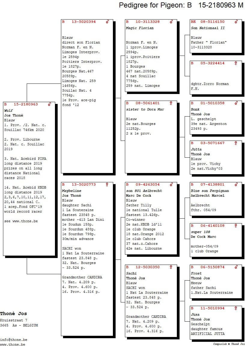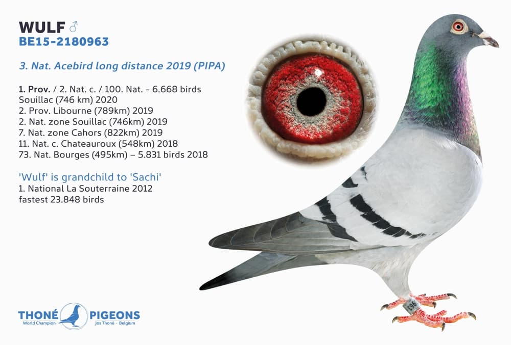 De vader van Wulf is een zoon van Magic Florian  (Norman) x zuster Dora Mar, de moeder is dan weer een dochter Sachi (1 Nat. La Souterraine) die gekoppeld zat aan ‘Son Aelbrecht 801 (Marc de Cock) en die vader is van Tilly 1e Nat. Tulle. Op deze Souillac wordt bovendien de Provinciale overwinning bij de jaarse behaald door Marc Vanonckelen met een kleinkind Sedna. Deze wint 62 Nat. van 7.514 d.