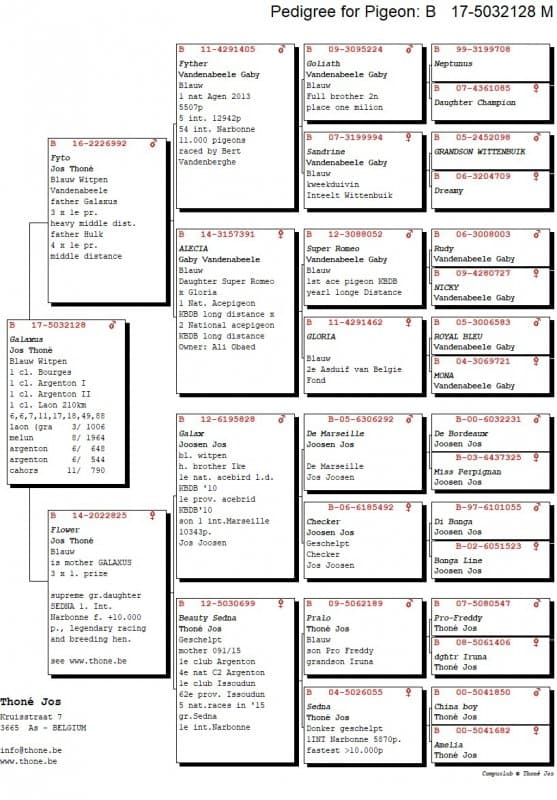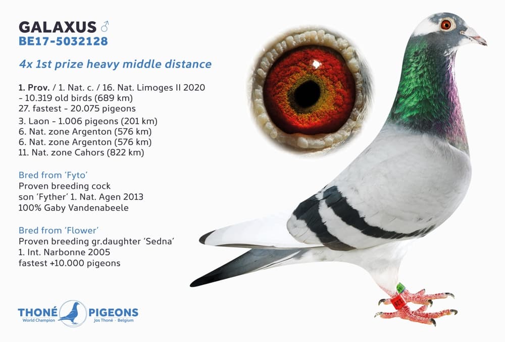 Vader van Galaxus is  Fytho een 100% Vandenabeele duif uit Fyther (1 Nat. Bordeaux) x dochter Super Romeo x Gloria