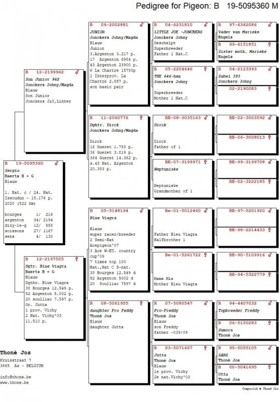 Vader van Sergio is Son Junior 962 een rechtstreekse Johny en Magda Jonckers duif.