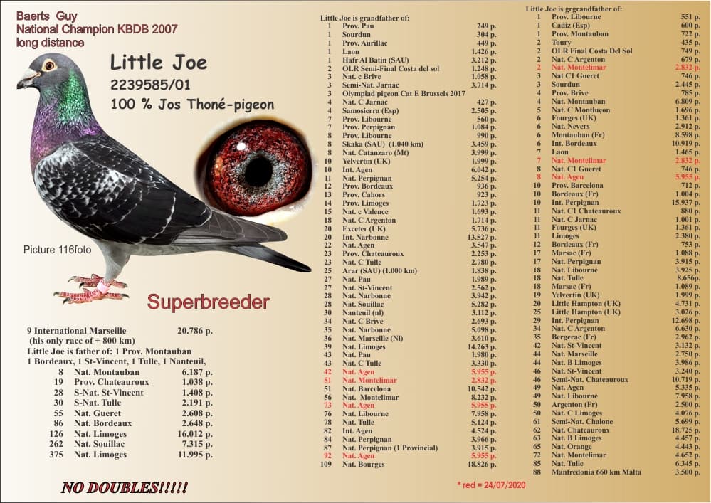 42 Nat. wordt gewonnen door een kruisingsprodukt van de bewezen Thoné duiven Little Joe en Sedna gekoppeld aan een zoon New Laureaat (Hugo Batenburg/Pec). De vader is Laureaat Narbonne zoon van de illustere New Laureaat (1 Int. Barcelona) die gekoppeld zat aan een dochter van Special One (1 Int. Barcelona) die zelf 2e Int. Narbonne won. Trouwens een andere dochter van Laureat Narbonne wint 74 Nat. Montelimar. Wat goed is komt snel…Laureaat Narbonne zat gekoppeld aan Pure Joe 100 een inteelt dochter van Little Joe  (Little Joe x zijn eigen dochter toen gekoppeld aan Sedna)