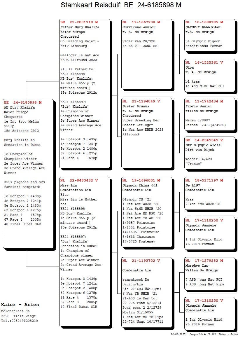 De vader van deze duif is “BE 23-2001710”, dit is een samenkweek tussen Kaier en Erik Limbourg. Hier werd een zoon van “Olympic Hurricane” gekoppeld aan de moeder van de fameuze “Geeloger” 1ste Nationale Asduif All Round KBDB 2023. De vader is dus een 100% Willem De Bruijn duif.