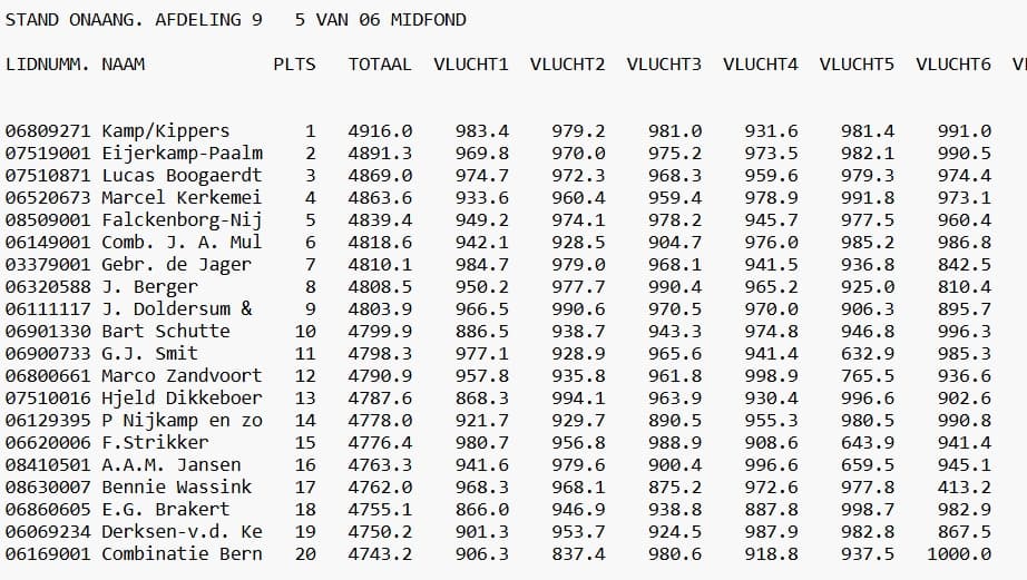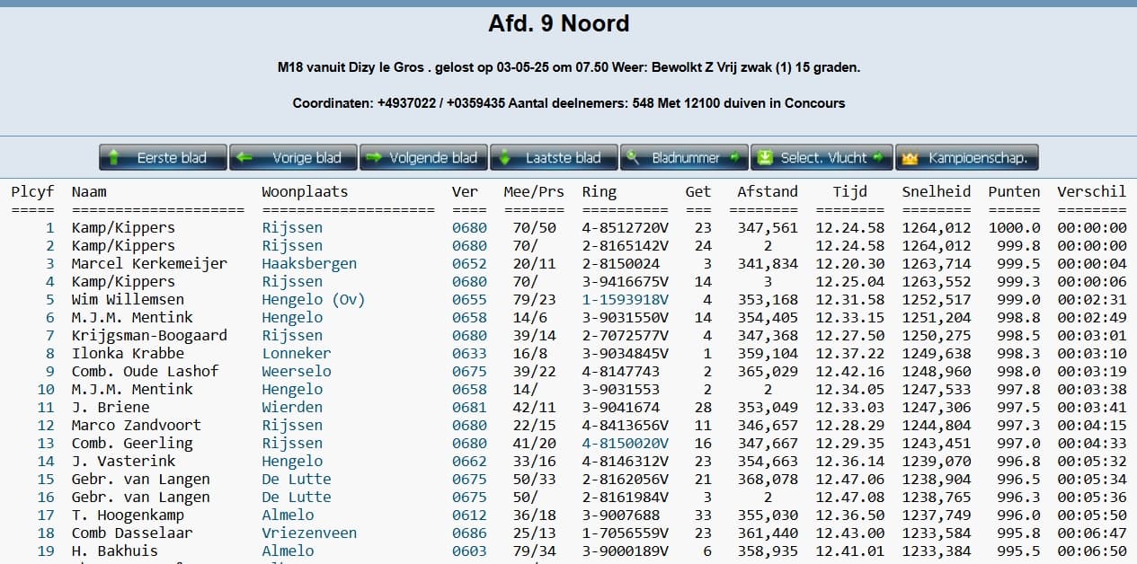 - Afdeling 9 tegen 14497 duiven: 3-9-82-212-350-358 enz. 17 prijzen van 35