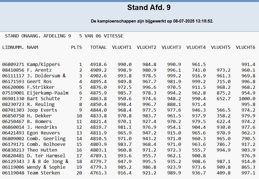 In 2025 lijkt er geen twijfel meer mogelijk: de combinatie Kamp/Kippers behoort tot de absolute top van de Nederlandse snelheidsduivensport. Jan Kippers en de broers Maarten en Robert Jan Kamp, actief in het sterke CC2 van Afdeling 9, groeien dit seizoen uit tot de referentie op vitesse en midfond. In een omgeving waar concurrentie allesbehalve mals is, worden ze tot het uiterste gedreven en die druk blijkt exact wat hen naar een uitzonderlijk niveau tilt.