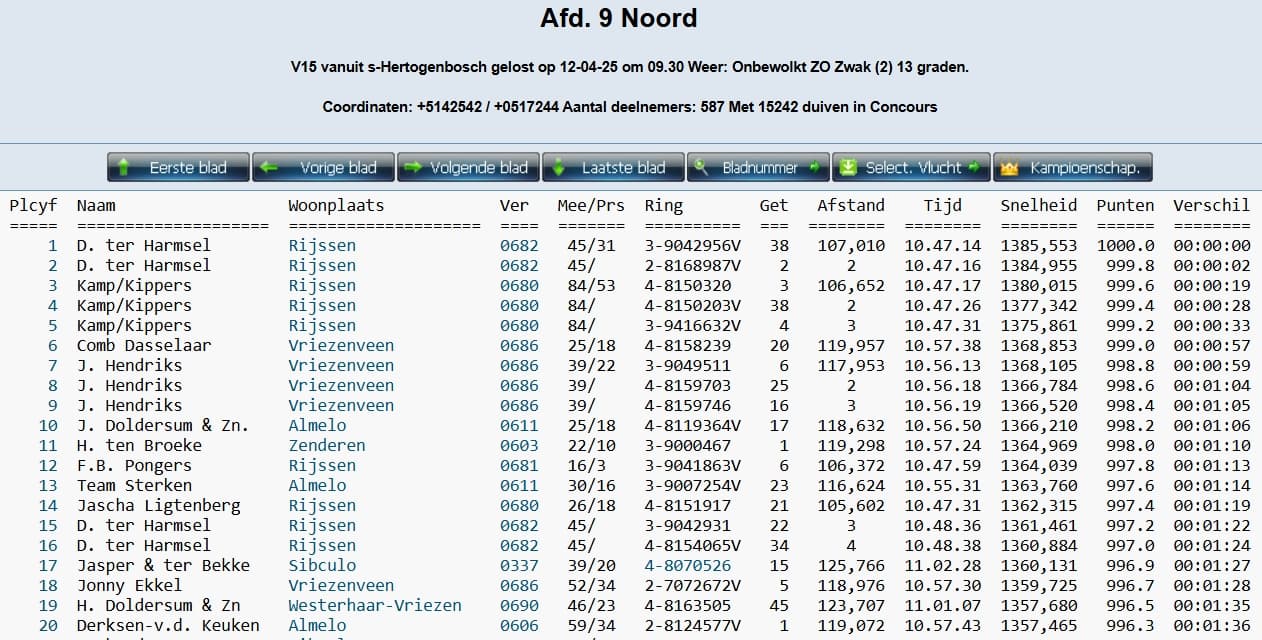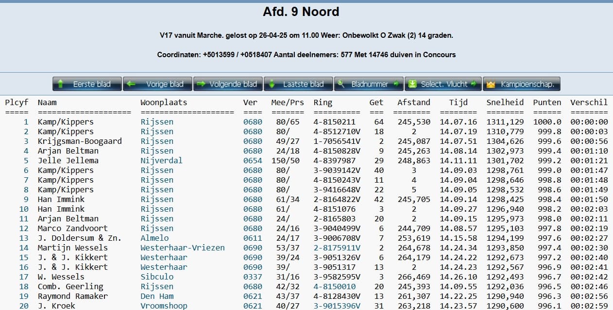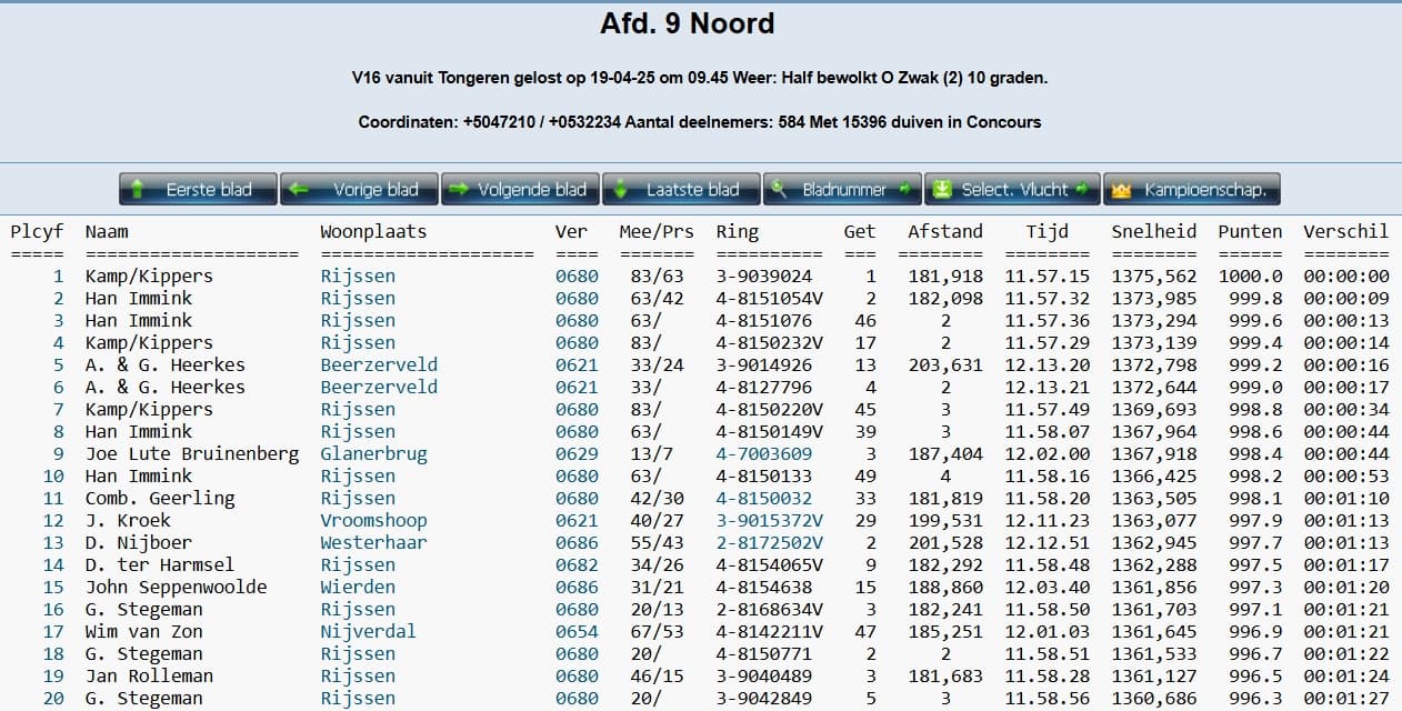 - Kring Noord tegen 3966 duiven: 3-4-13-14-16-25-29-30-54-217-232-254-361 enz. 21 prijzen van 30