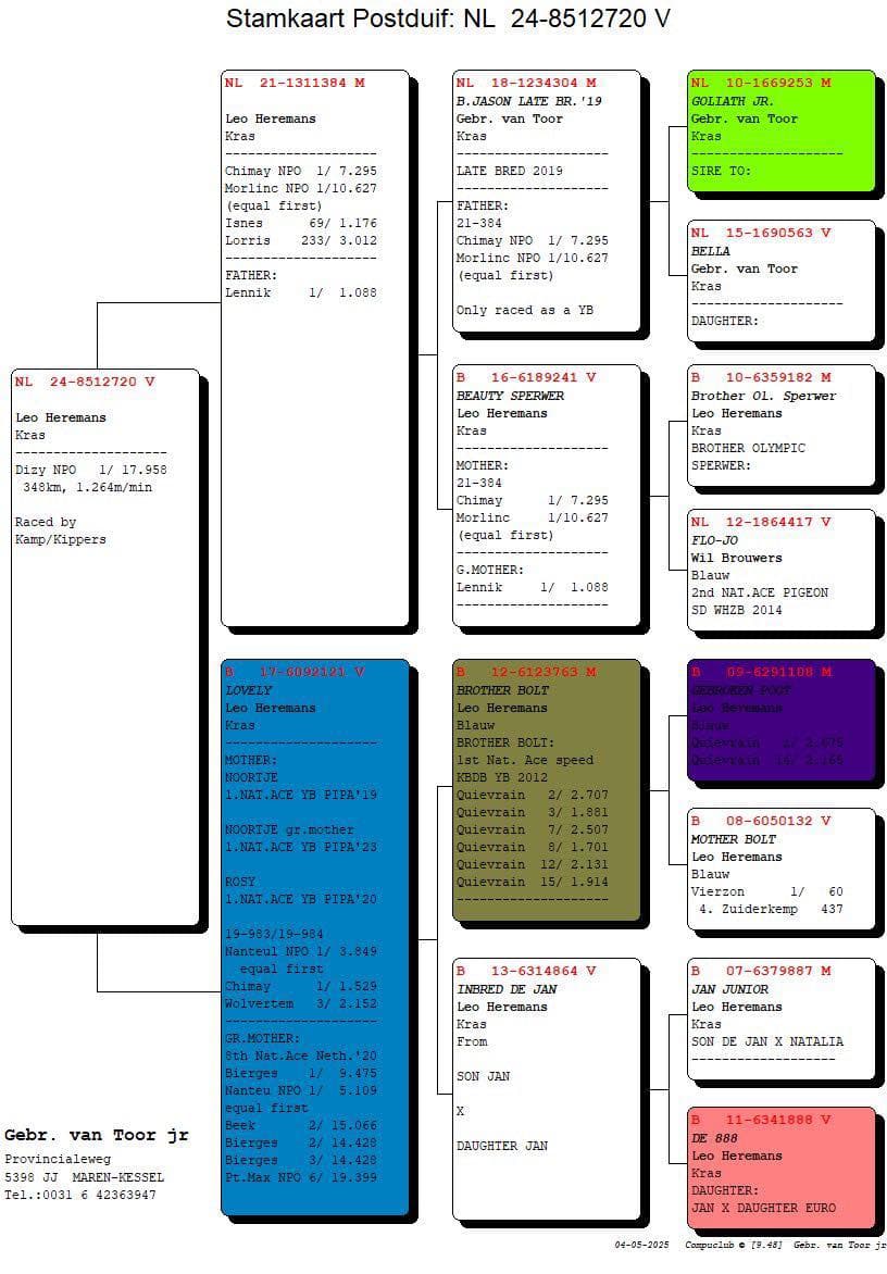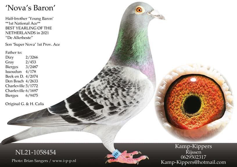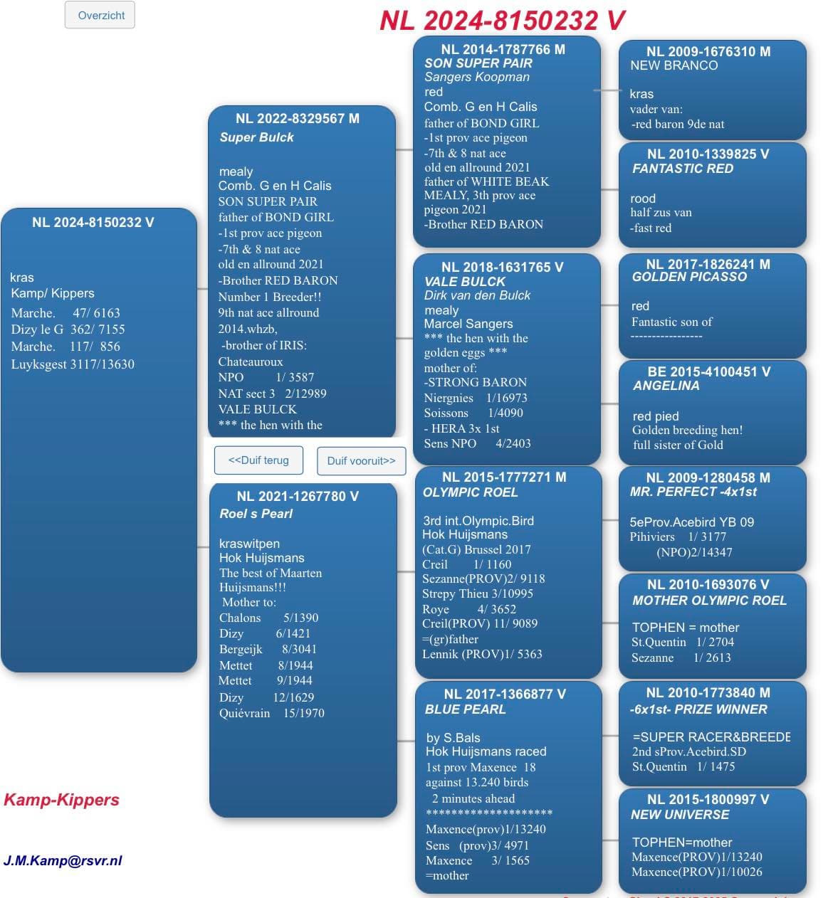 Een week later, op 19 april, volgt al een eerste zege op de volledige lossing: 1e, 4e en 7e tegen 15.396 duiven. Nova’s Baron speelt een hoofdrol in de afstamming en is vader van onze 1e (x dochter Basebreeder) en 3e duif (x duivin van Geurt Doppenberg ). Opnieuw een dochter van Super Bulck in de kop van de uitskag, deze keer gekoppeld aan Roels’ Pearl.