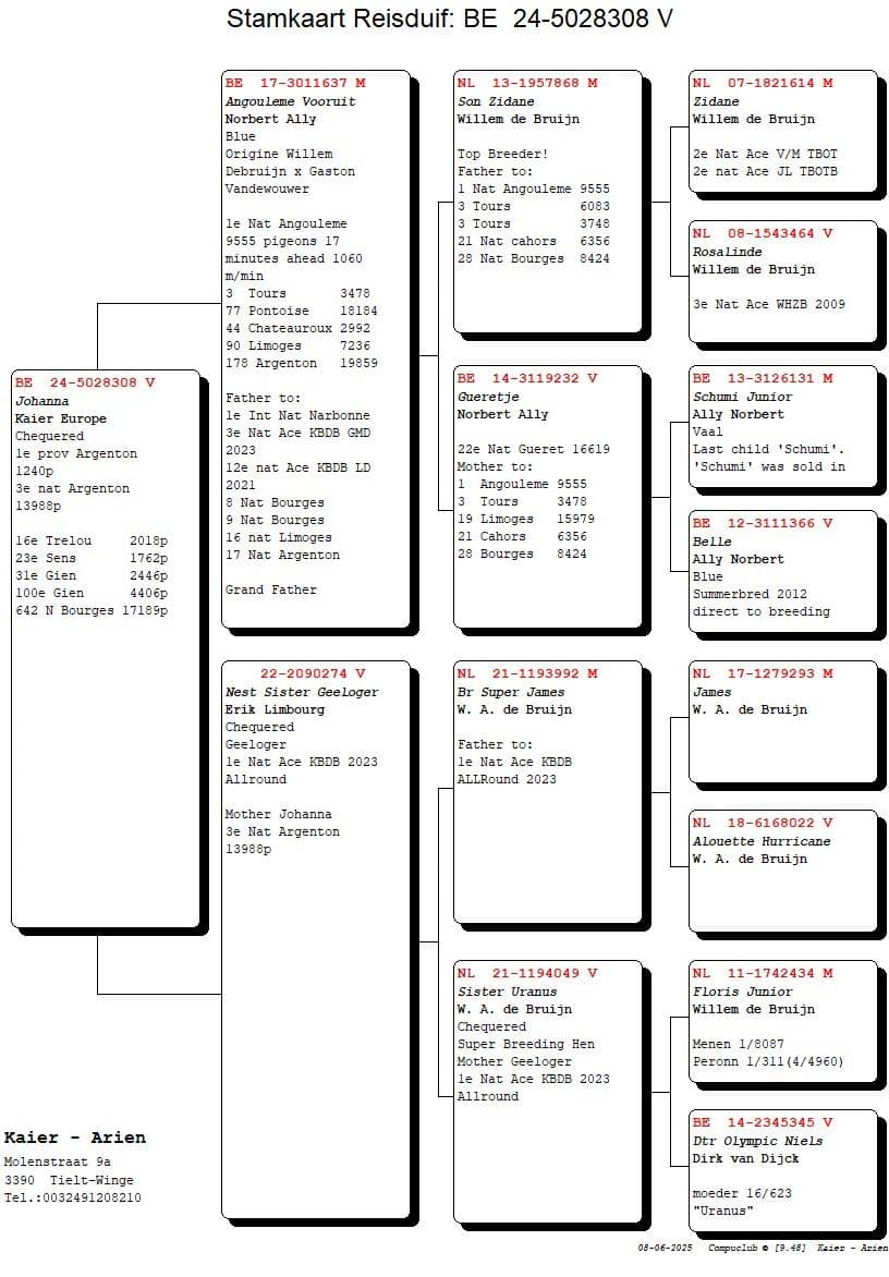 Dochter van “NL 992/21” Broer Super James Willem De Bruijn x “NL 049/21” Zus topkweker Uranus. Deze laatste werd ook al grootmoeder van 1ste I.Prov.Melun 9.551 duiven in 2025 gevlogen bij het hok van Kaier in Schriek en is dus ook grootmoeder van “Burj Khalifa”. Deze duif was de beste duif in de One loft race in Dubai en vloog daar een geweldig palmares bij elkaar. Daarom werd deze duif ook 1ste Champion op Champions winner, 2de Super Asduif winnaar en 3de Grand Average winnaar.