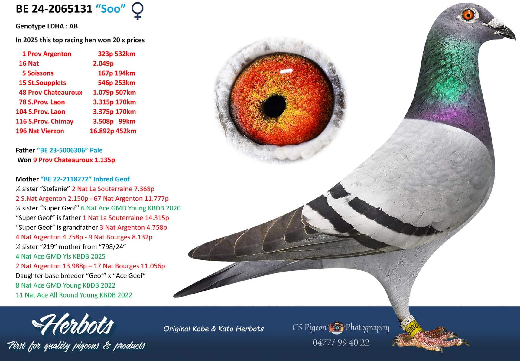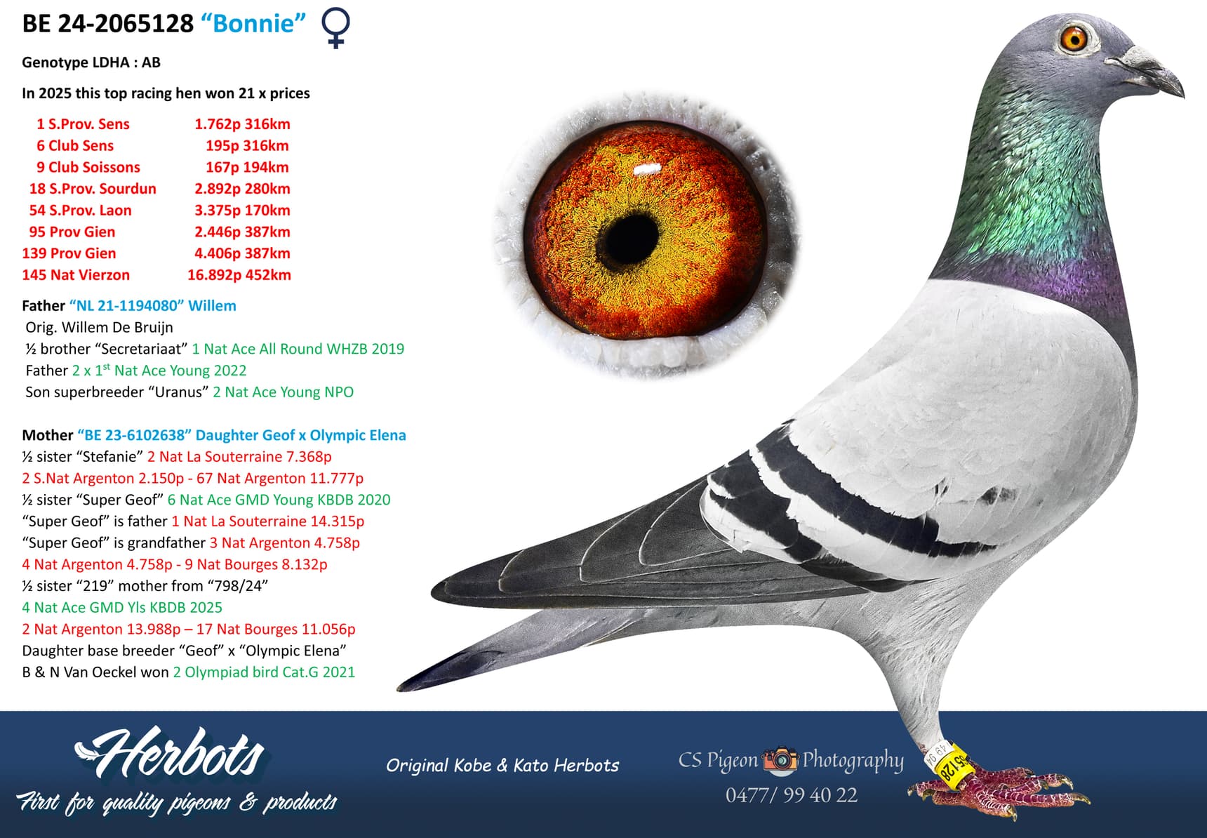 Niet alleen dit seizoen doen de duiven van Kobe en Kato Herbots het geweldig op andere locaties, wat zowel hen als de andere liefhebbers gelukkig maakt. Maar dit seizoen was toch wel heel uitzonderlijk met alle referenties die we voorlopig nog maar weten dankzij de “Geof” lijn. Een kweeklijn die als je naar deze pedigrees kijkt heel makkelijk kruist tegen andere bloedlijnen en dan ook zeer succesvol is. Bekijk deze stambomen heel goed en je zal veel andere topduiven tegenkomen die tegen deze kinderen of kleinkinderen van “Geof” worden gekoppeld.