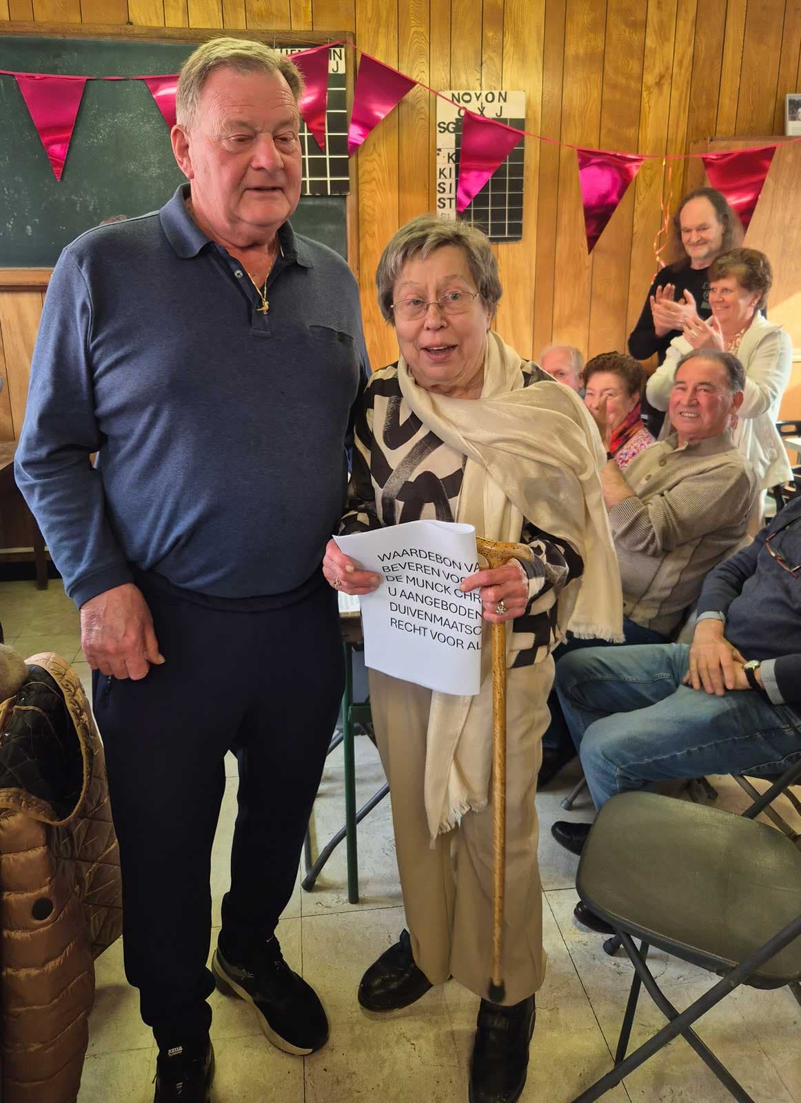 Tijdens de viering kregen dan ook enkele absolute steunpilaren de welverdiende aandacht. Voorzitter William (foto hierboven) werd op gepaste wijze gehuldigd voor maar liefst 60 jaar trouwe dienst in het lokaal. Of het nu gaat om de manden klaarzetten, de duiven aanpakken of het zetten van de constateurs; William is altijd van de partij met een helpende hand. Ook medebestuurder Willy (foto hieronder), die ondertussen 50 jaar dienst op de teller heeft staan, mocht van Christiane ook een prachtig dinermenu in ontvangst nemen als blijk van grote waardering.