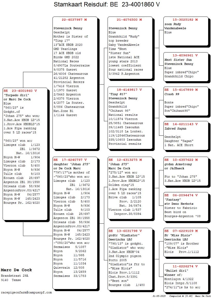 Wie een blik werpt op de stamboom van BE 23-4001860 ziet meteen dat deze duif gebouwd is op pure klasse. Haar pedigree is een staalkaart van nationale en provinciale toppers uit de afgelopen decennia. Aan vaderszijde vinden we rechtstreekse afstamming van Steveninck Benny, met talloze nationale topnoteringen op Châteauroux, La Souterraine en Argenton in deze lijn. Aan moederszijde gaat het onder meer terug op de legendarische “Johan 275” – winnaar van o.a. 3e Nat. Asduif KBDB LD'15 en 1e Prov. Asduif KBDB LD '15 – en diens uitzonderlijke dochter “797/17”, die zelf een bewezen kweekduif is. In deze lijn zitten ook gekende kampioenen, stuk voor stuk iconen in de moderne duivensport.