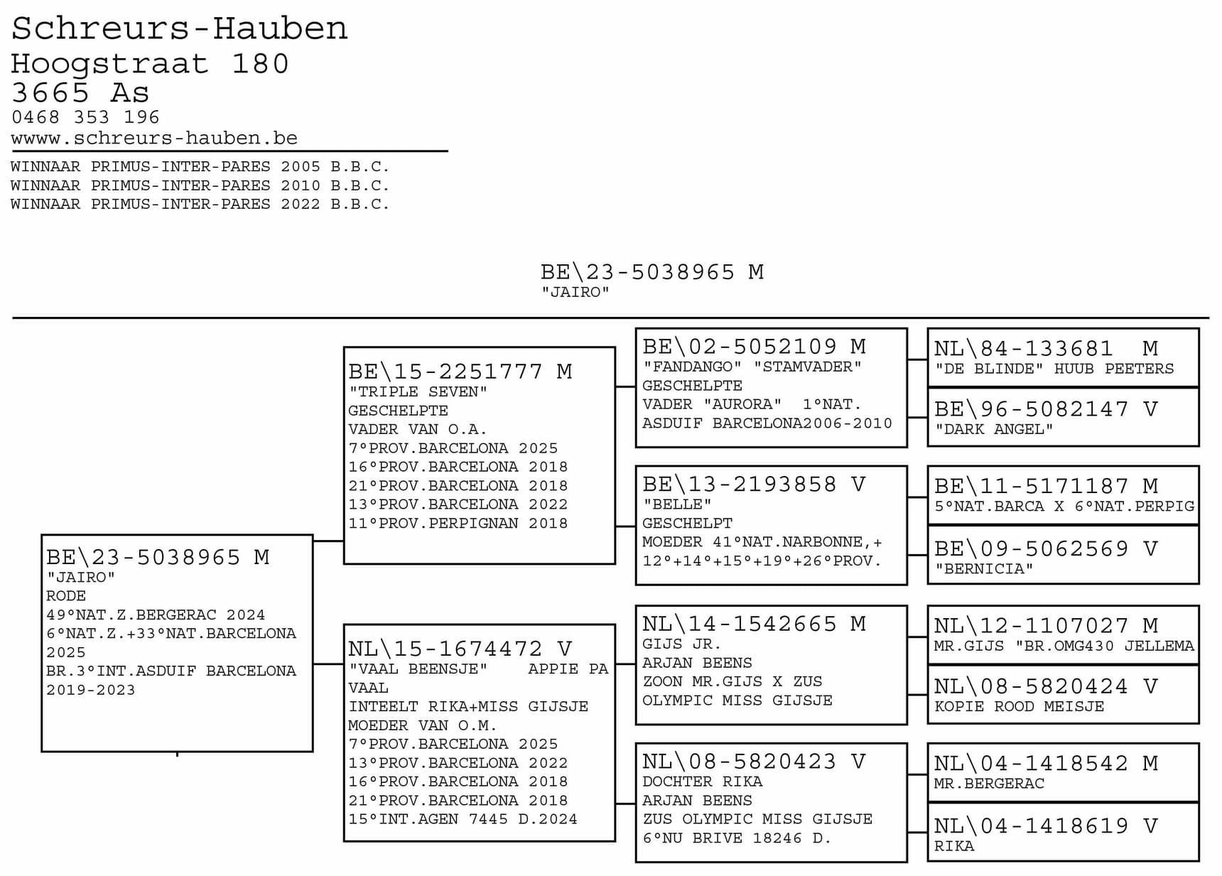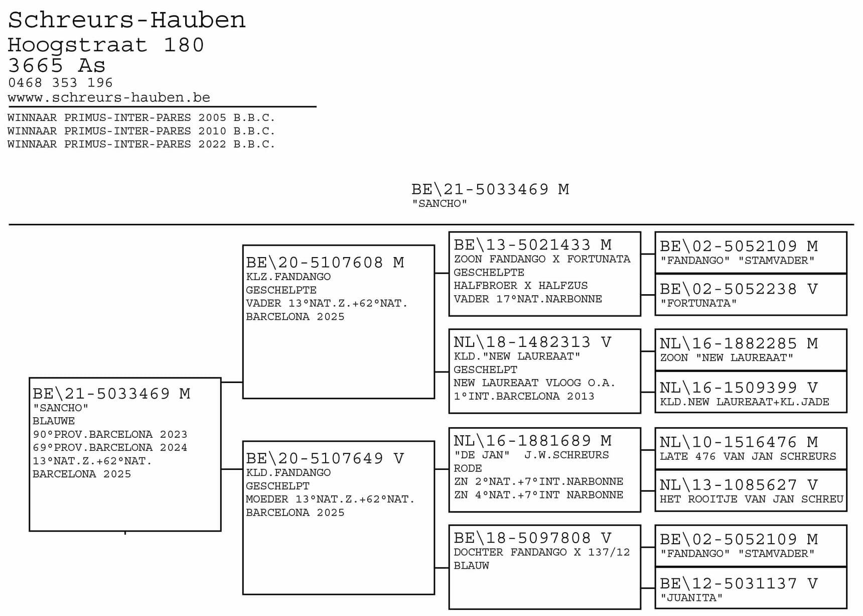 Zoon van "433/13" Zoon stamvader Fandango x "NL 213/18" Kleindochter New Laureaat 1 Int.Nat Barcelona Luc Wiels
