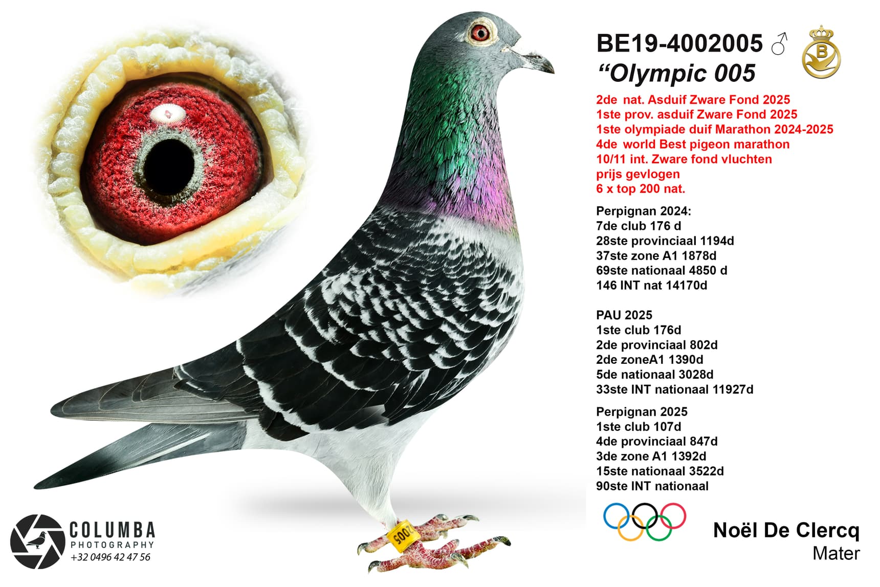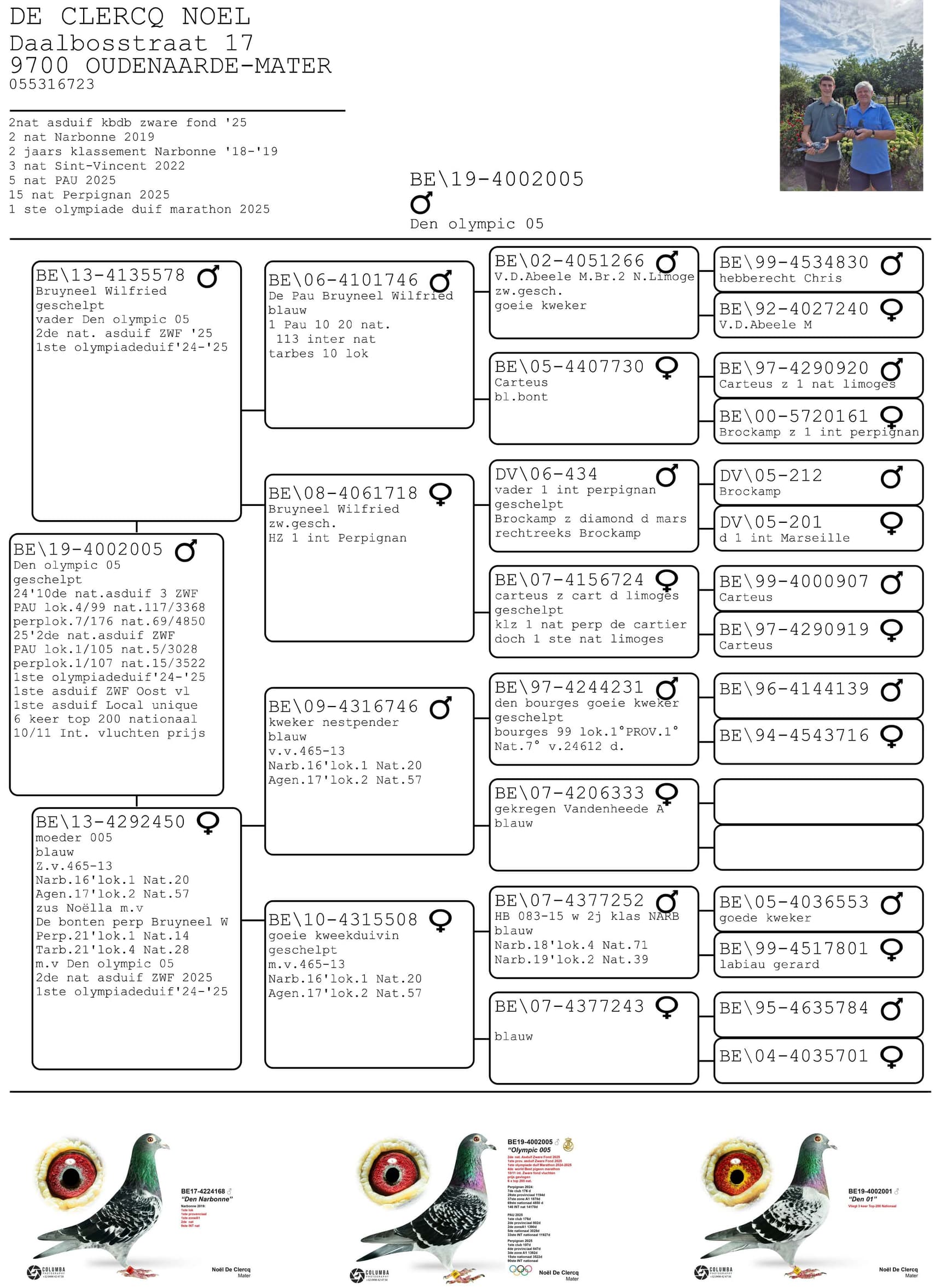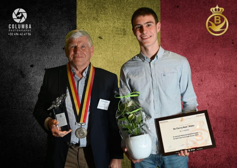 De donker geschelpte duiver met ringnummer BE19-4002005 was na zijn zeer sterke prestaties de 005 genoemd onder het motto ‘hou het maar simpel’, maar nadat hij bekroond werd tot de 1e Belgische duif op de Olympiade in Dortmund is hij officiëel herdoopt tot Olympic 005. Het is duif met een gemiddeld gabarit, niet groot, maar met zijn 6 jaar allesbehalve beproefde spieren, een zachte pluim en een heel gepigmenteerd oog, een echte mooie duif ! Ook wel wat een nerveus type. Hij had het voorrecht om rustig te mogen uitgroeien in zijn jeugd. Als jonge duif weinig of niet in de korf, en als jaarling de normale vluchten tot 500 kilometer. Normaliter is het dan het plan dat de tweejaarse duiven naar het hok van de oude duiven gaan en de zware fond vliegen, maar door een overtal aan jaarlingen mocht hij nog een jaartje rijpen op het hok van de jaarlingen en dat programma meevliegen. Dus is hij pas op de leeftijd van 3 jaar getest op de zware fond. Blijkbaar had het extra jaar stage hem wel gesterkt in zijn kunnen want hij vloog in zijn carrière 10 vluchten op de zware fond en daarvan miste hij er maar eentje, namelijk zijn eerste. Nadien was hij 9 keer paraat waarvan enkele keren knettervroeg op de uitslag. Als bekroning zeker de titel van 2e nationale asduif zware fond en 1e Belgische duif op de Olympiade Dortmund in de categorie fond. Wat Noël ook wou toevoegen bij dit alles is het feit dat op Perpignan 2026 zijn 005 voor het eerst in zijn leven tijd heeft verloren bij thuiskomst. Vooreerst stelt Noël dat hij alle respect heeft voor de 1e nationale asduif van Mevrouw Deweerdt & Zonen en geen enkel resultaat betwist. In de vorige vluchten aarzelde de 005 nooit bij thuiskomst en was hij steeds razendsnel geklokt, maar op de ochtend van 3 augustus om 9 u 22 kwam hij uit de oostelijke richting en toerde nog een drietal keer rond het huis vooraleer hij zin had om binnen te komen. Was het de euforie van het thuiskomen, de voldoening van deze topprestatie die hem tot deze ererondes dreef ? Niemand zal het weten, maar het verschil met de eerste asduif is heel nipt. Soit, c’est la vie…en iedere speler heeft dit al wel eens voor in zijn carrière, maar met de titel van 2e nationale asduif, 1e provinciale asduif, 4th World Best Pigeon, 1e Olympiadeduif België is zijn diploma netjes gevuld !