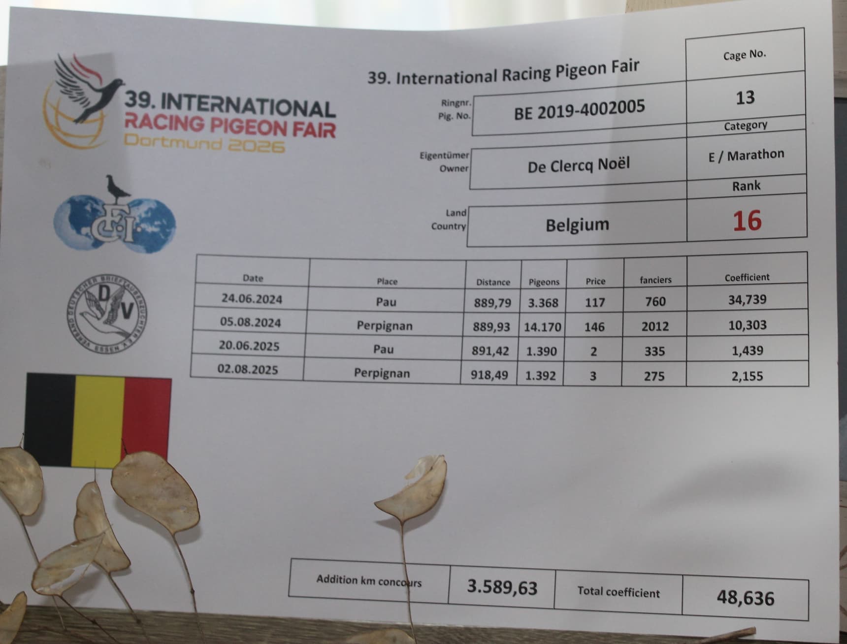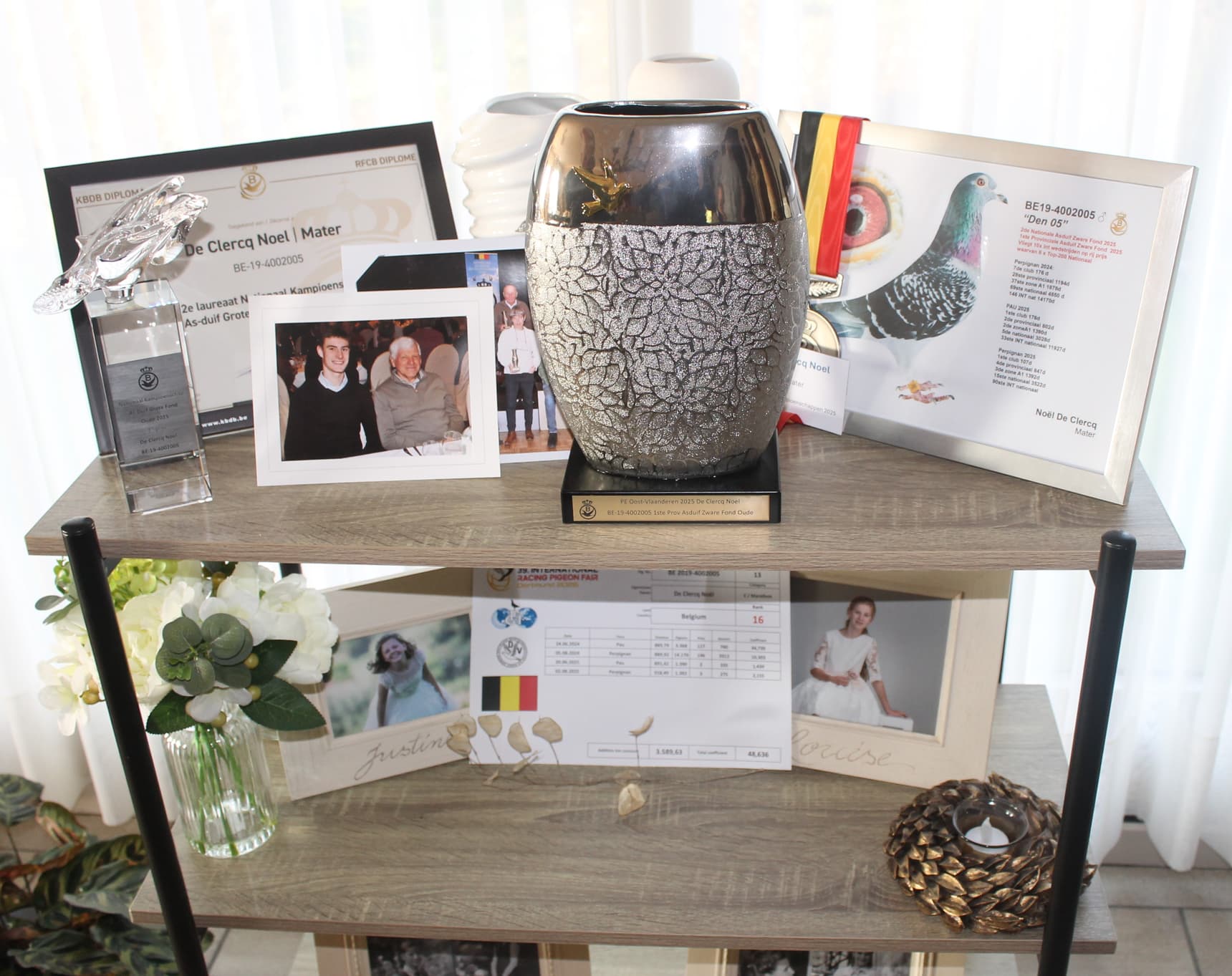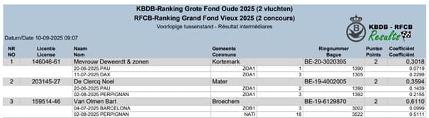 noël de clercq (mater-oudenaarde) bezit met olympic 005 1e olympiade belgië fond en 2e asduif zware fond k.b.d.b.