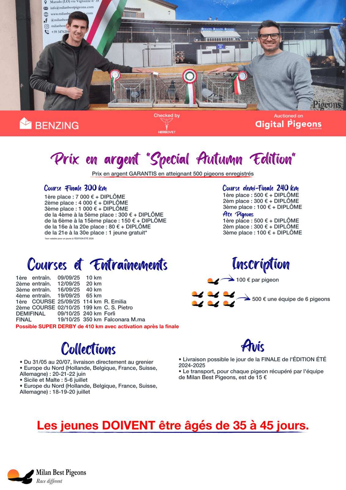 Het inschrijvingsgeld voor 1 duif bedraagt €100 plus €15 voor verzending naar Italië.