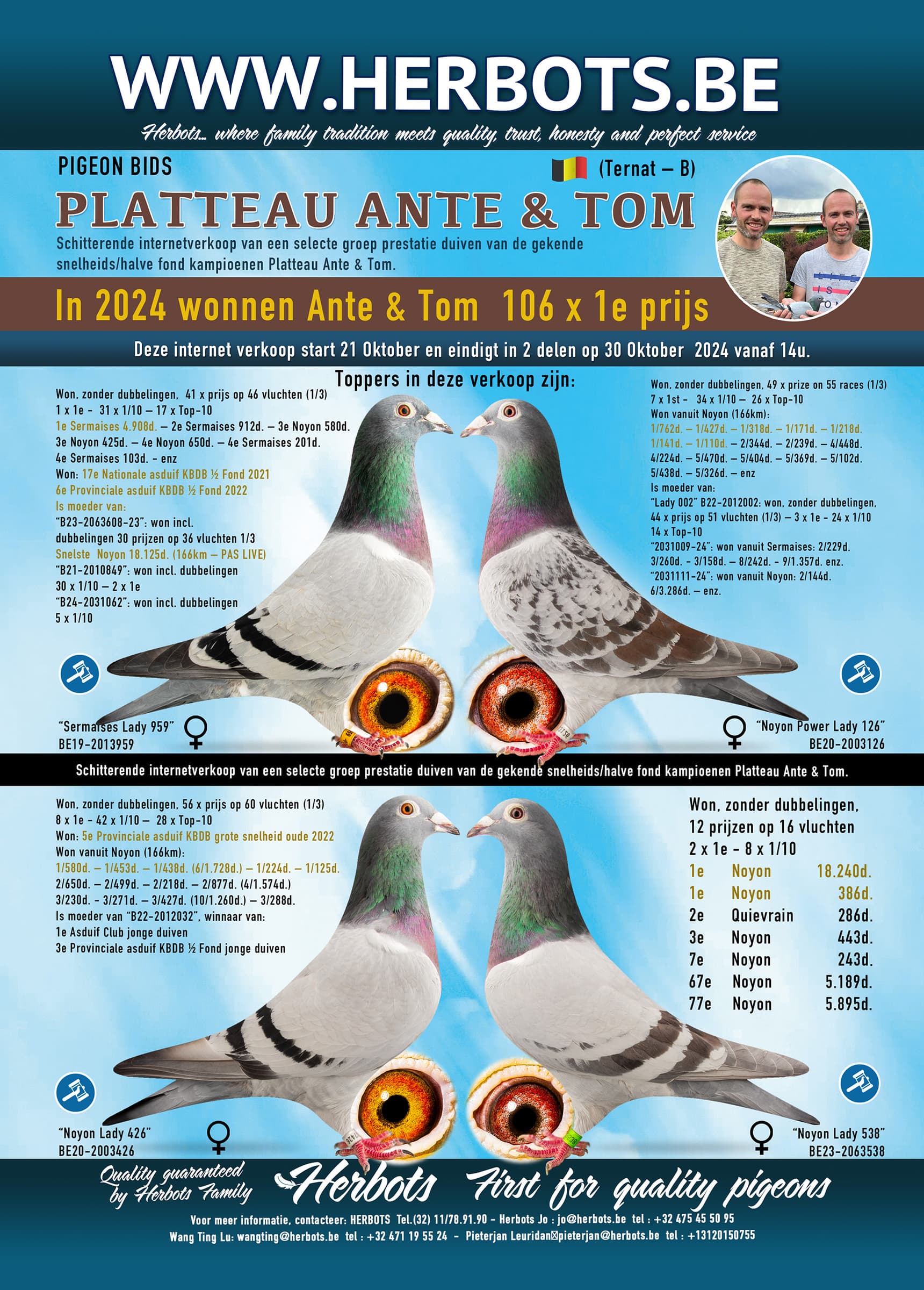 De talloze referenties bewijzen dat de duiven van Ante en Tom uit de goeie genen bestaan. Duiven die door deze twee gepassioneerde melkers tot het uiterste gedreven worden met geweldige resultaten tot gevolg. En zoals reeds vermeld…ze houden niet van papieren duiven, duiven met stambomen zijn minder belangrijk. Hier wordt enkel en alleen naar het resultaat gekeken. Daardoor zijn deze duiven voor ieder hok een versterking, want ze hebben de kwaliteiten om topprestaties te leveren van Quiévrain tot Argenton.