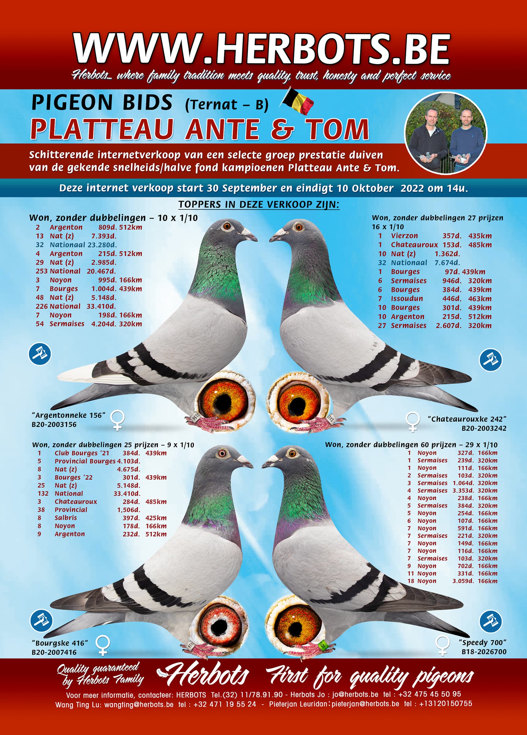 De talloze referenties bewijzen dat de duiven van Ante en Tom uit de goeie genen bestaan. Duiven die door deze twee gepassioneerde melkers tot het uiterste gedreven worden met geweldige resultaten tot gevolg. En zoals reeds vermeld…ze houden niet van papieren duiven, duiven met stambomen zijn minder belangrijk. Hier wordt enkel en alleen naar het resultaat gekeken. Daardoor zijn deze duiven voor ieder hok een versterking, want ze hebben de kwaliteiten om topprestaties te leveren van Quiévrain tot Argenton.