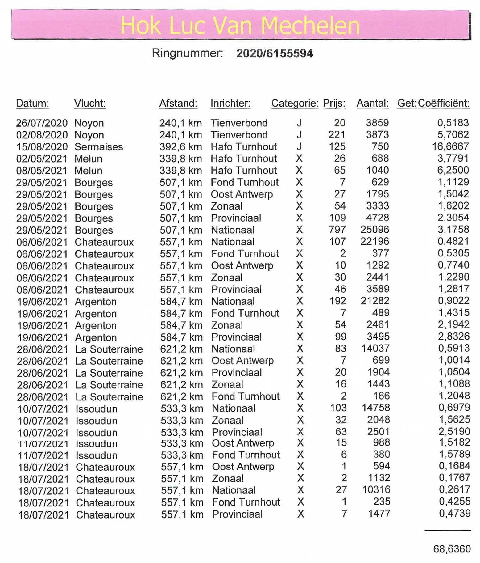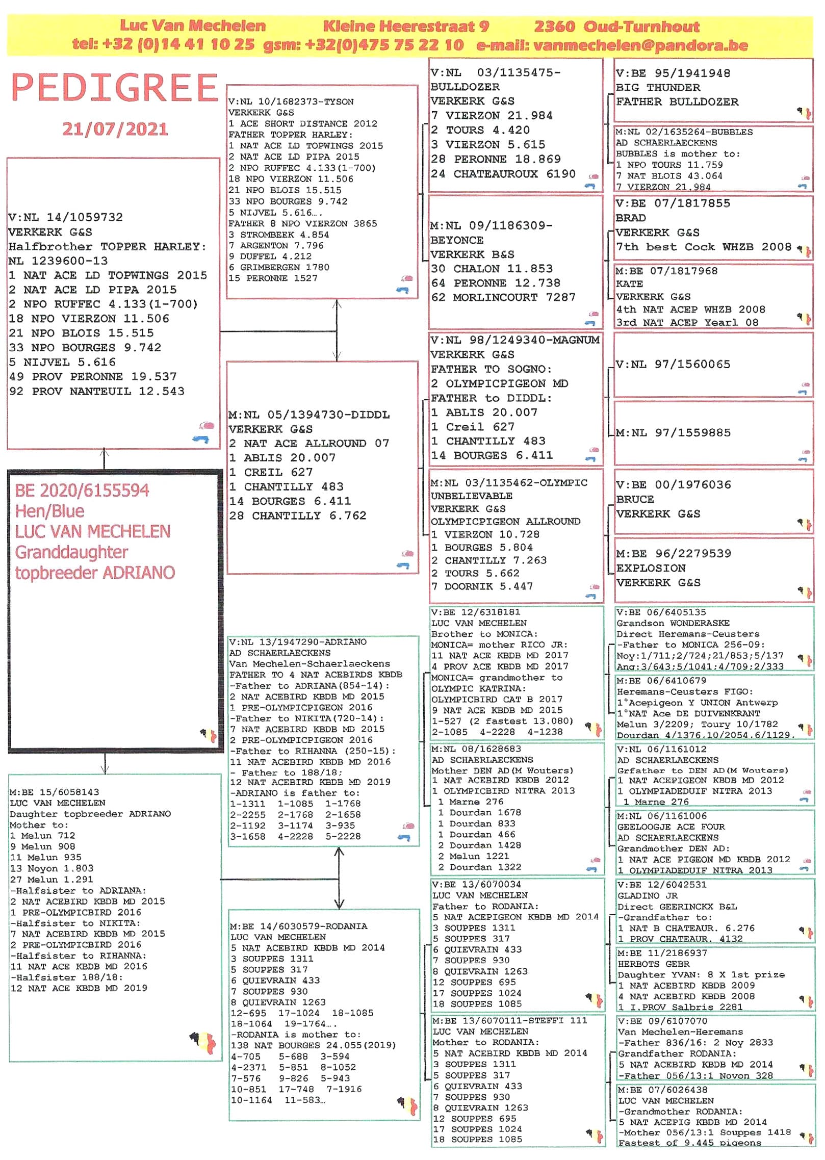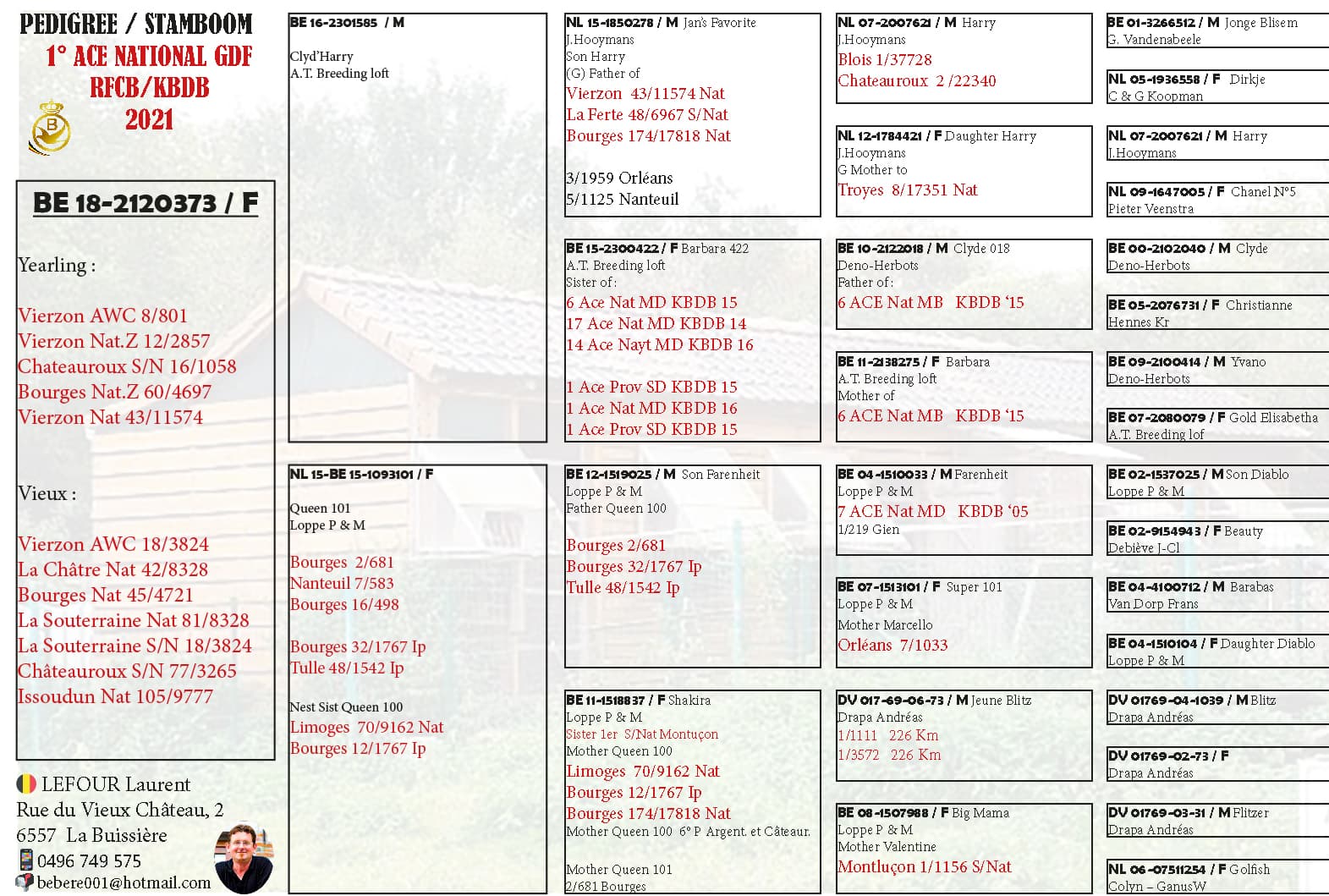 Hereby the pedigree of the first pigeon in the  catogory 6 races: BE18-2120373 of Lefour Laurent: