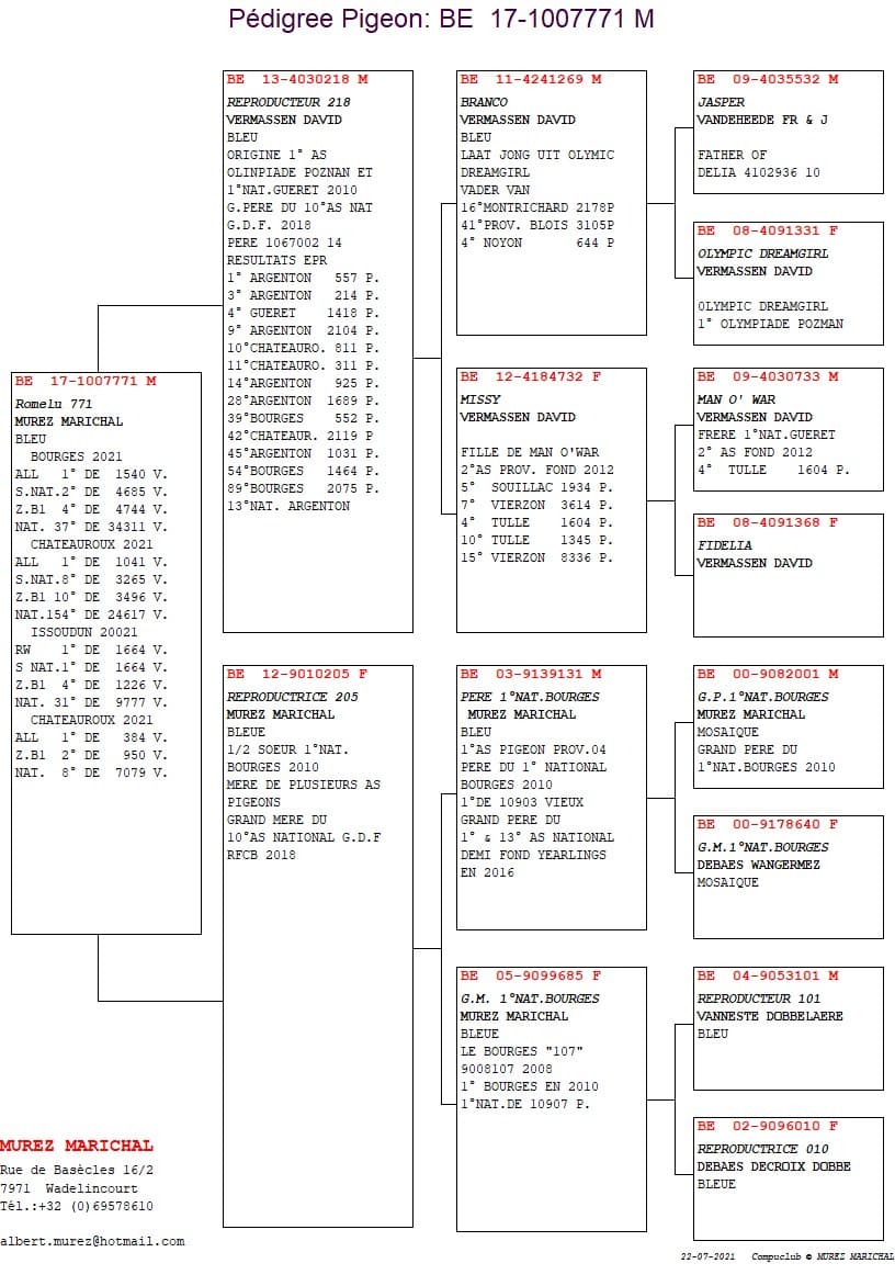 Hereby the pedigree and pictures of the first pigeon in the  catogory "Ace pigeon - 4 races" of Murez - Marichal Albert (BE-17-1007771)
