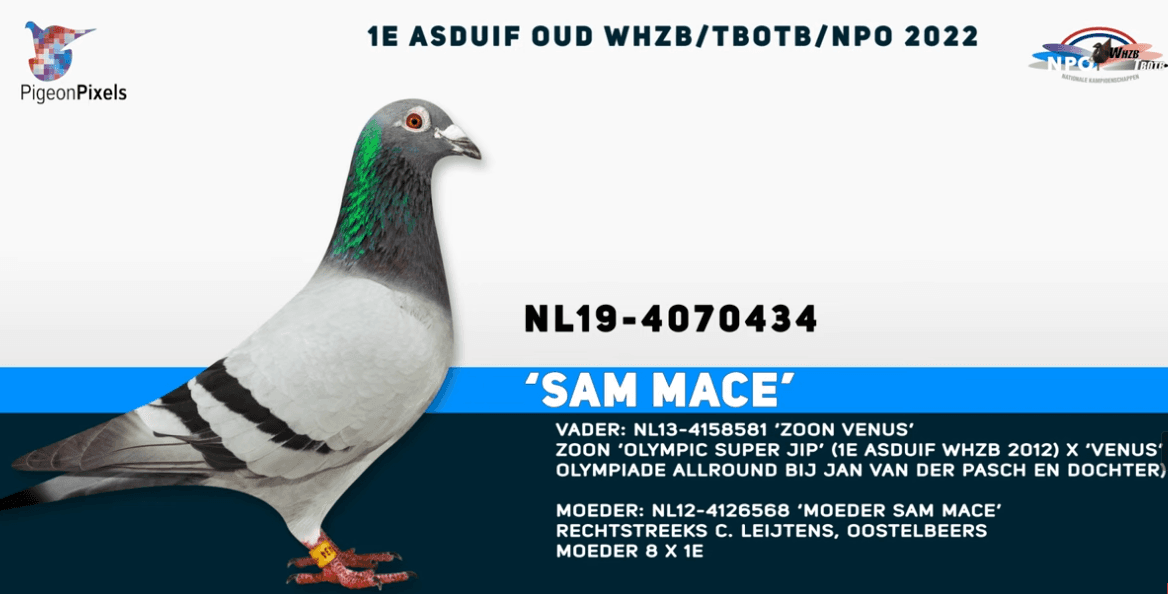Bij de kolonie Van der Linden won hij met NL 19-4070434 “Sam Mace” de 1ste Nationale Asduif All Round oude WHZB / NPO 2022 met een 50% Van de Pasch duif. Zijn vader is een zoon van “Olympic Venus” 2de Olympiadeduif Cat.D Poland 2011.