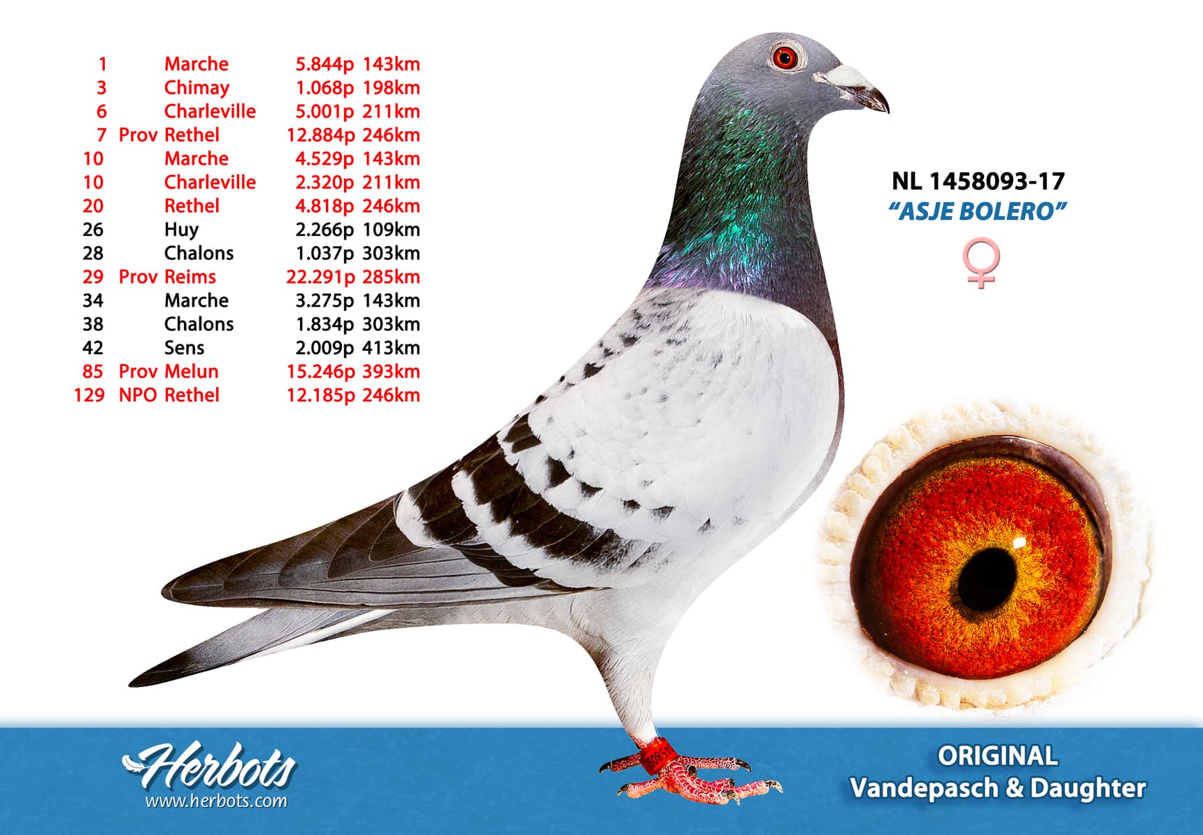Deze topduiver “Jaronneke” NL 21-1330498 werd 1ste Nationale Asduif Jonge NPO 2021, hij heeft 50% Van de Pasch bloed in zich. Zijn vader is een kleinzoon van “Hurricane 289” en “Dochter Jupiter”.