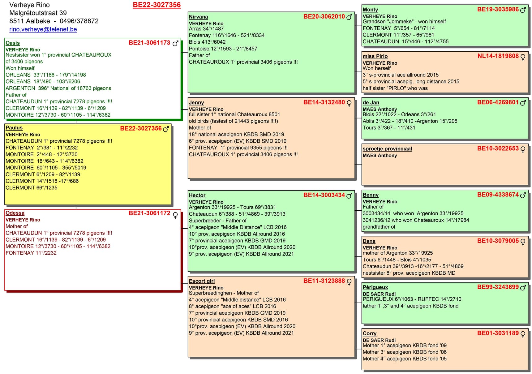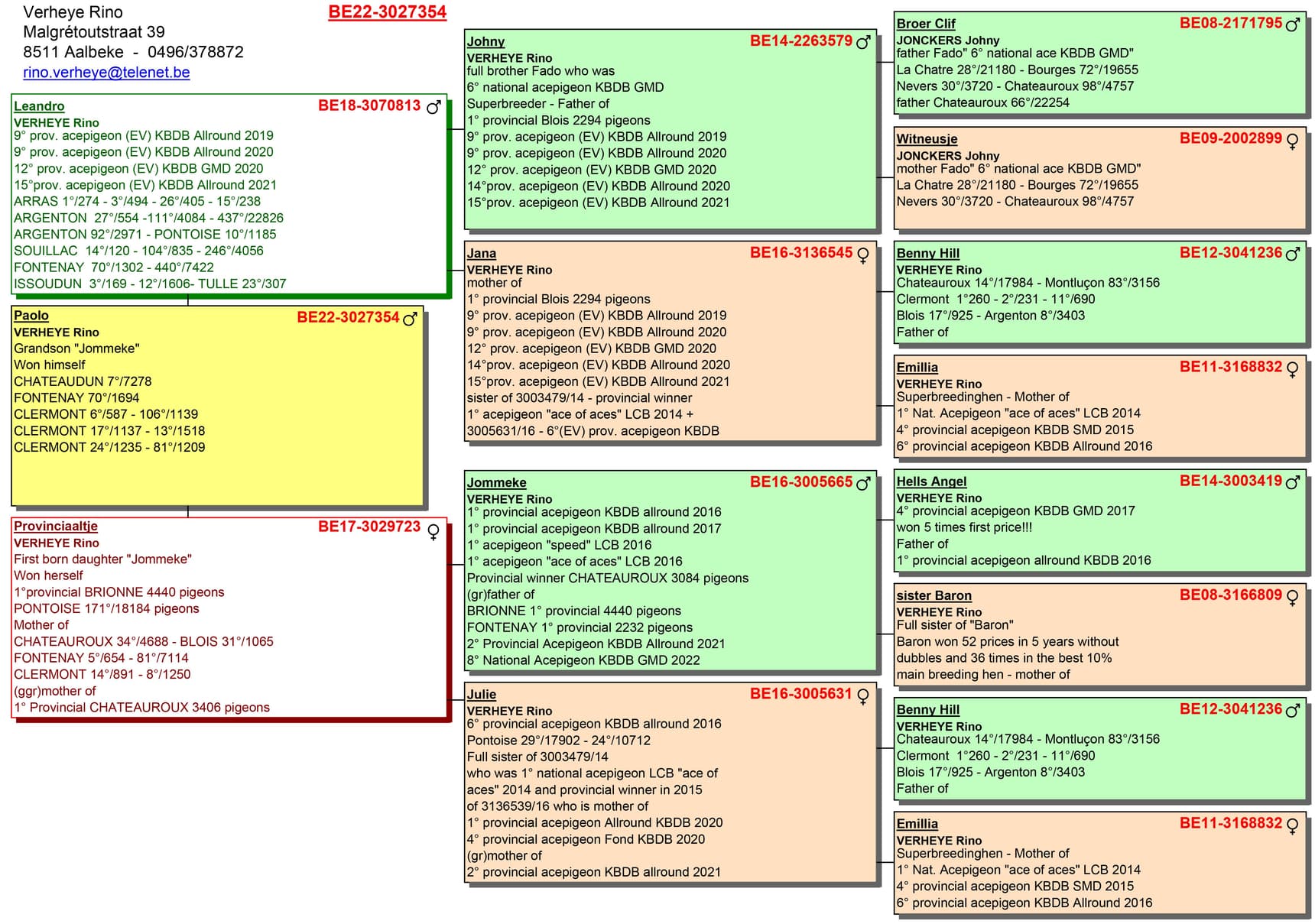 We weten tot welke prestaties de kolonie van Rino Verheye in staat is en op Chateaudun was het vorig weekend bingo. Hij wint 1,6 en 7 tegen 7.278 oude en jaarse samen en is dus de snelste van allemaal. Keihard weer en dan zijn ze op hun best. De jaarlingen die het grootste gedeelte van de vliegploeg verdedigen kwamen super goed en tonen hier dat ze er klaar voor zijn. Na vorig seizoen echt één van de beste seizoenen ooit te maken is deze kolonie weer klaar om te schitteren op de komende nationale vluchten. We stellen hier de eerste 3 duiven aan jullie voor die alweer allemaal uit de pure basis komen van deze kolonie met “Jommeke” en stamkoppel “Benny Hill” x “Emillia” als rode draad.