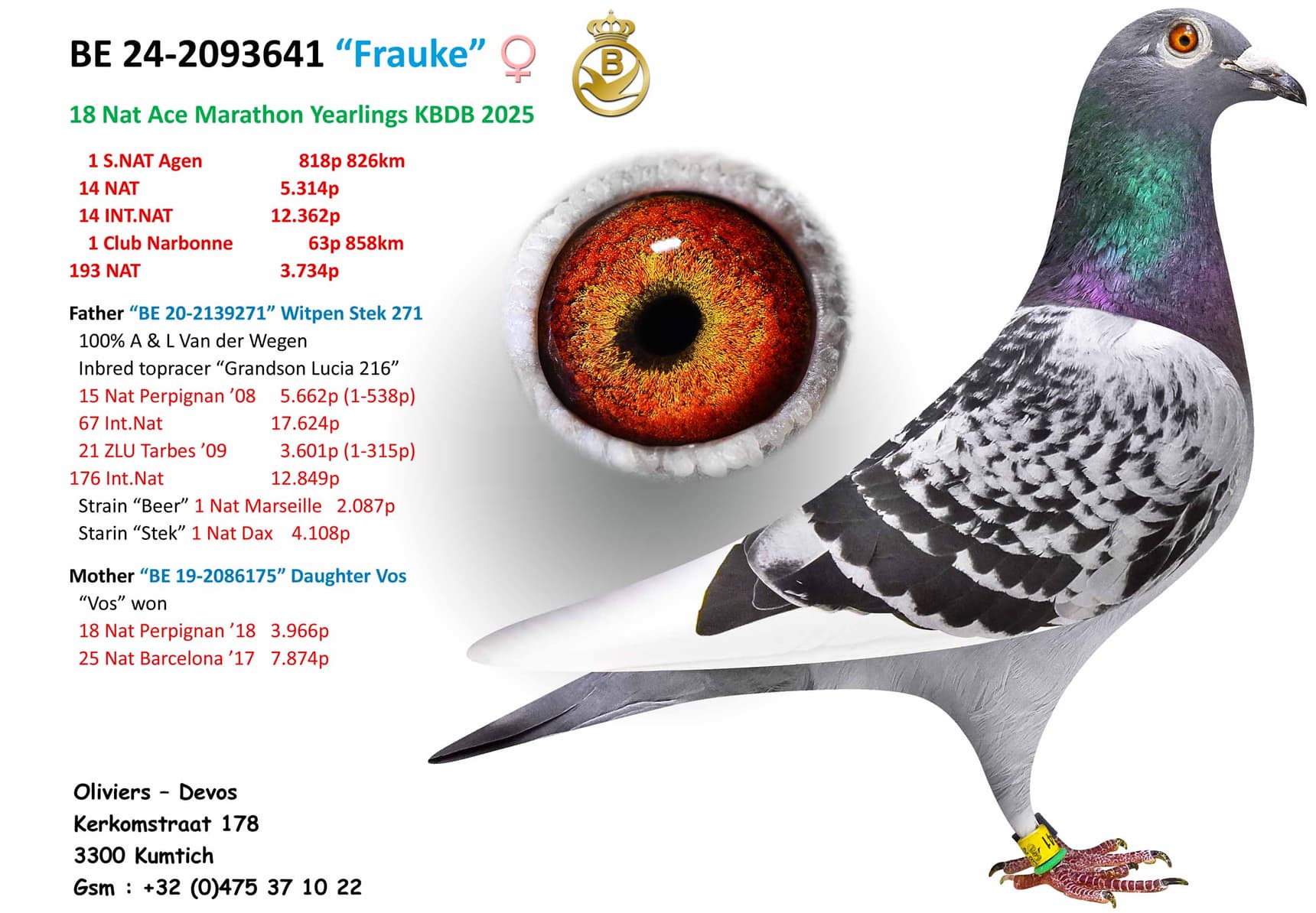 De andere duiven op het vlieghok zijn vaak gelinkt aan ofwel “De Vos” BE 14-2322604. Deze topper won 18de Nationaal Perpignan en 25ste Nationaal Barcelona en vooral zijn kleinkinderen doen het super op de kweek. Zowel de topduivin “Frauke” als “De Fekke” zijn kleinkinderen van deze topduif.