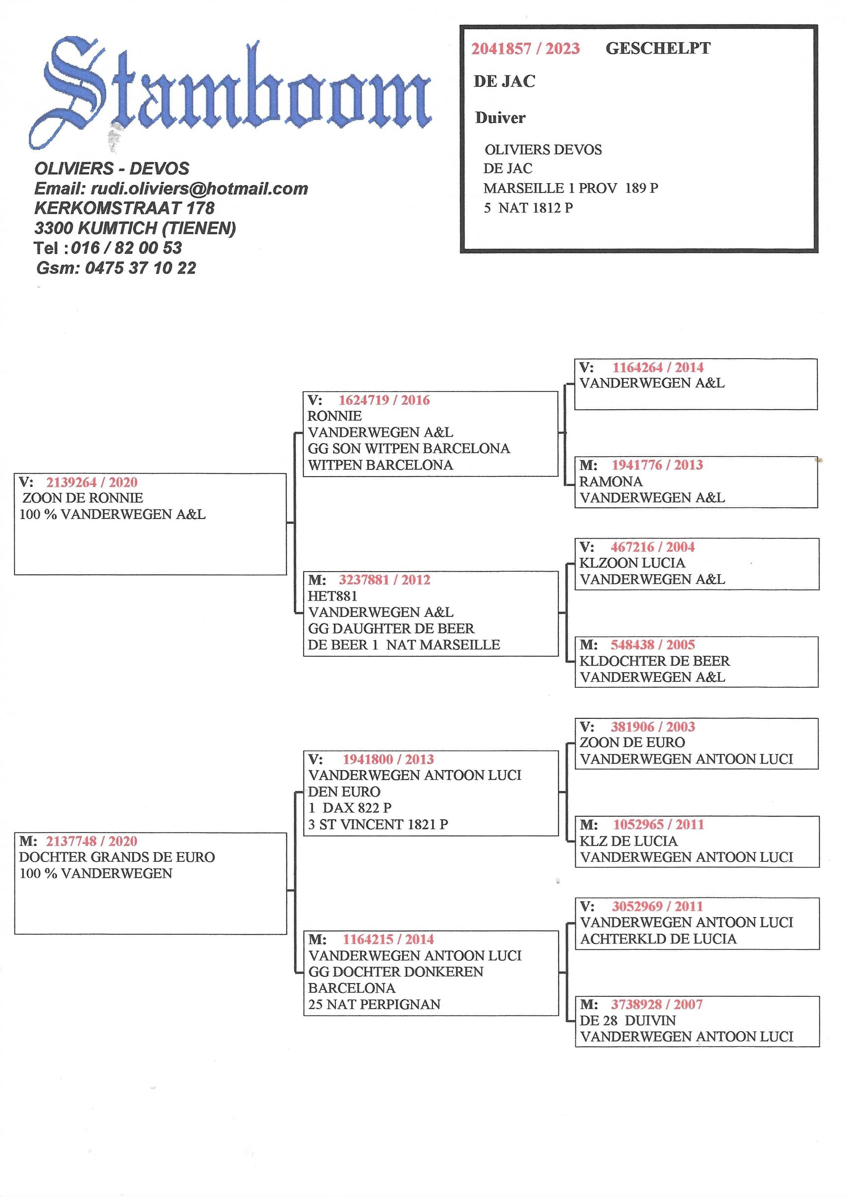 Zoon van “719/16” Ronnie is rechtstreeks A & L Van der Wegen en lijn “Witpen Barcelona” 10 Nat Barcelona + 36 Nat Narbonne x “881/12” rechtstreeks A & L Van der Wegen en is lijn “Lucia” 15 Nat Perpignan en “Beer” 1 Nat Marseille