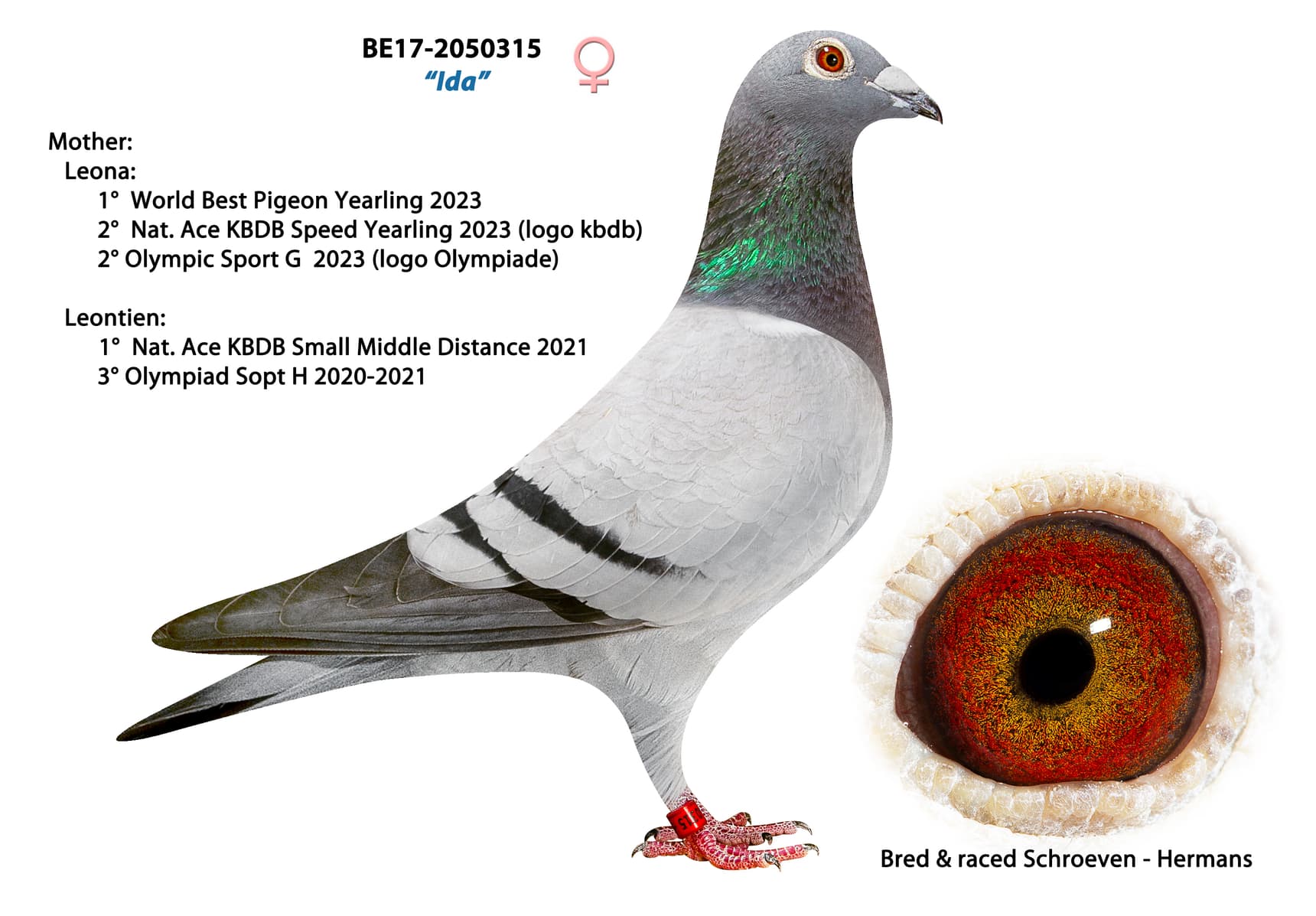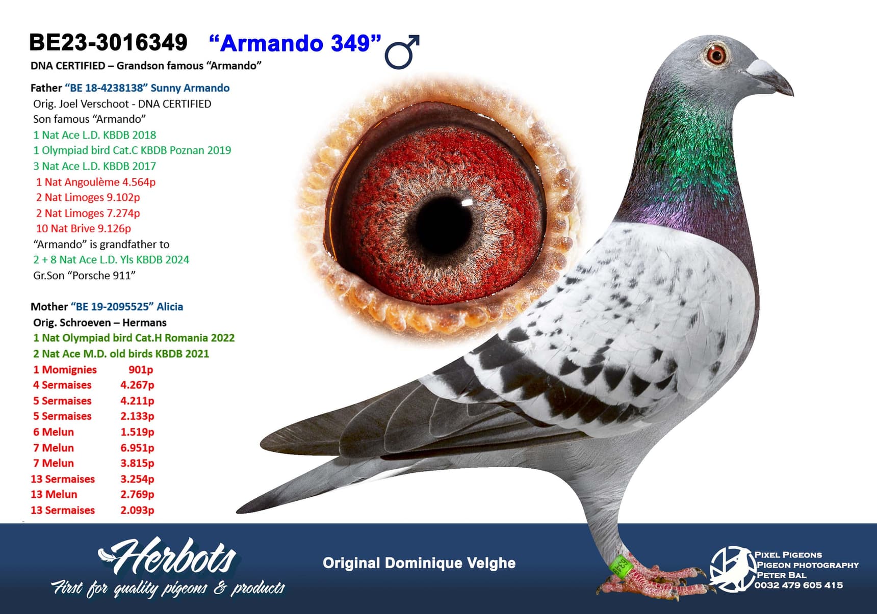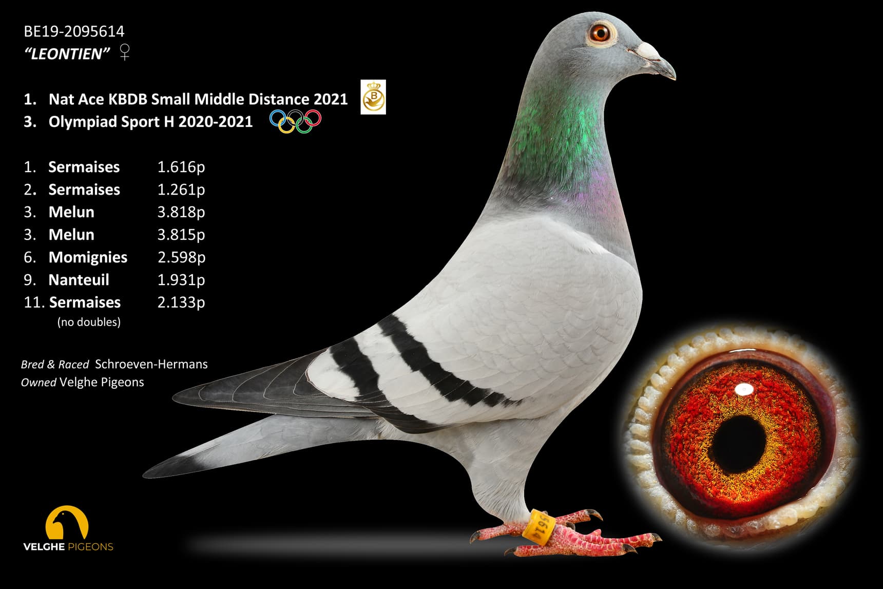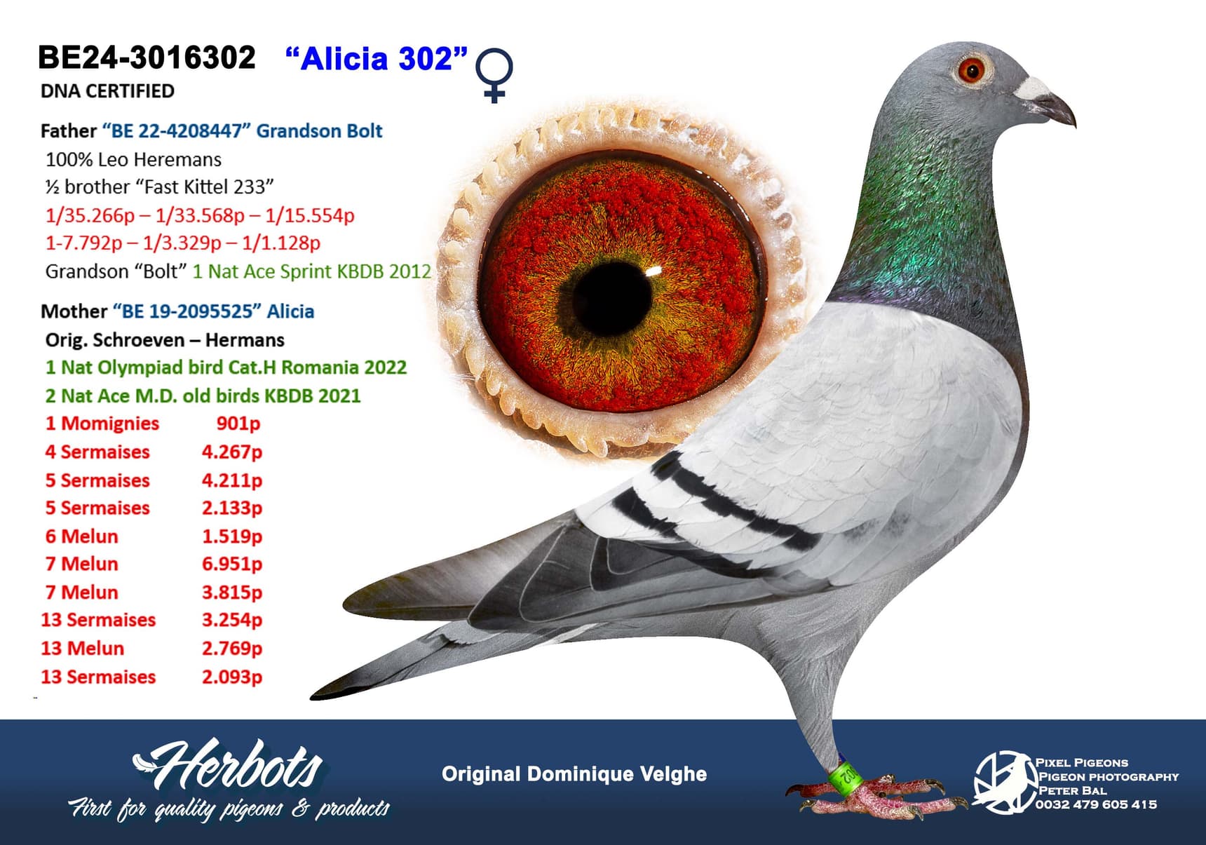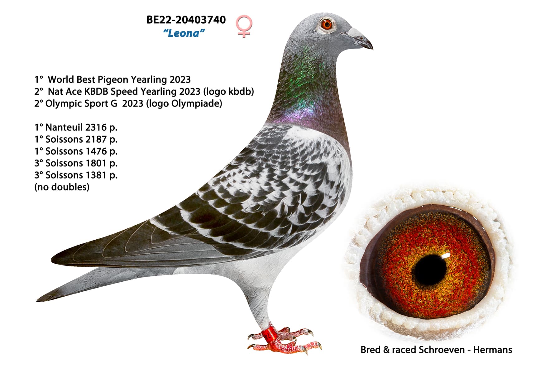 Deze topduivin won 3 x 1ste – 9 x 1:100 en vloog ook nationale vluchten met daarin schitterende resultaten. Ook haar kinderen vlogen dit seizoen super tot en met de laatste nationale vlucht van Chateauroux.