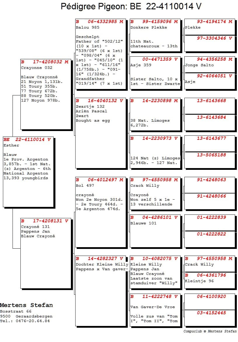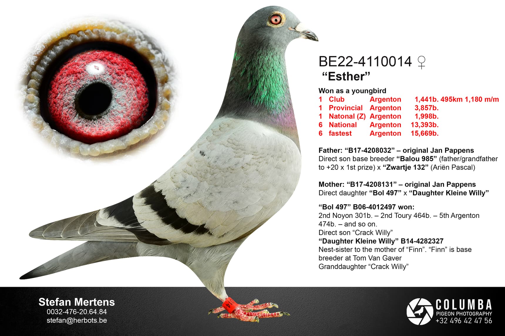 Esther is gekweekt uit 2 duiven die rechtstreeks van Jan Pappens uit Zwalm komen, en is een halfzus, zelfde vader, van o.a. 9e prov. Orleans tegen 19.203d. en een halfzus, zelfde moeder van o.a.: 4e Melun 1.067d. - 5e Chevrainvilliers 812d. enz..